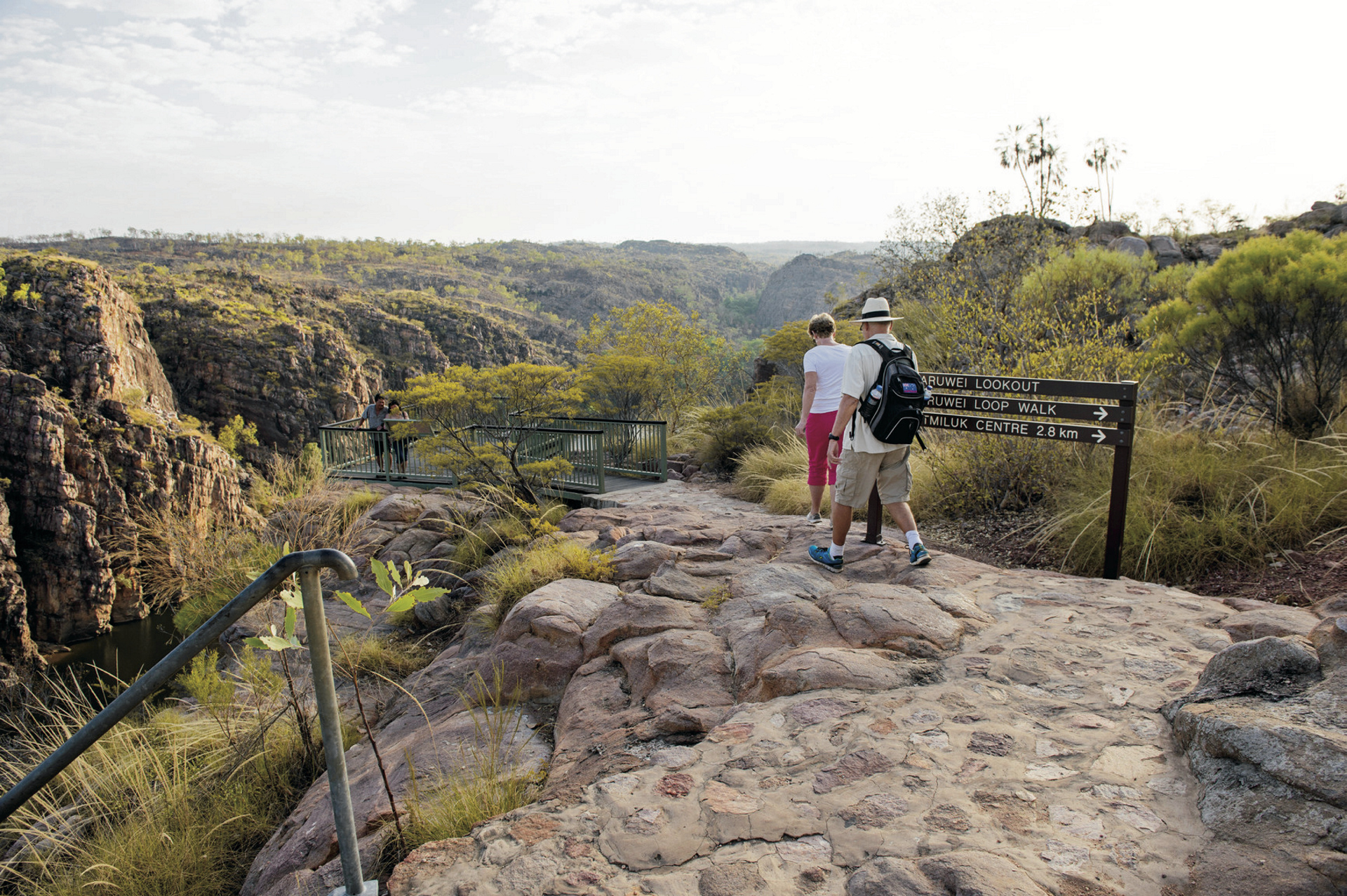 Nitmiluk - Katherine Gorge (ca. 65 km).Der bekannte Nitmiluk (Katherine Gorge) Nationalpark liegt nur ca. 30 Autominuten entfernt. Ein Schluchtensystem bestehend aus 13 Schluchten lädt ein, zu Land, zu Wasser und aus der Luft erkundet zu werden. Es gibt fantastische Wandermöglichkeiten unterschiedlichen Anspruchs mit atemberaubenden Ausblicken in die Schlucht hinab. Beliebt sind Bootsfahrten (optional), allen voran die zum Sonnenuntergang mit Abendessen an Bord. Aber auch aus der Luft per Helikopter bieten sich unvergessliche Ausblicke.