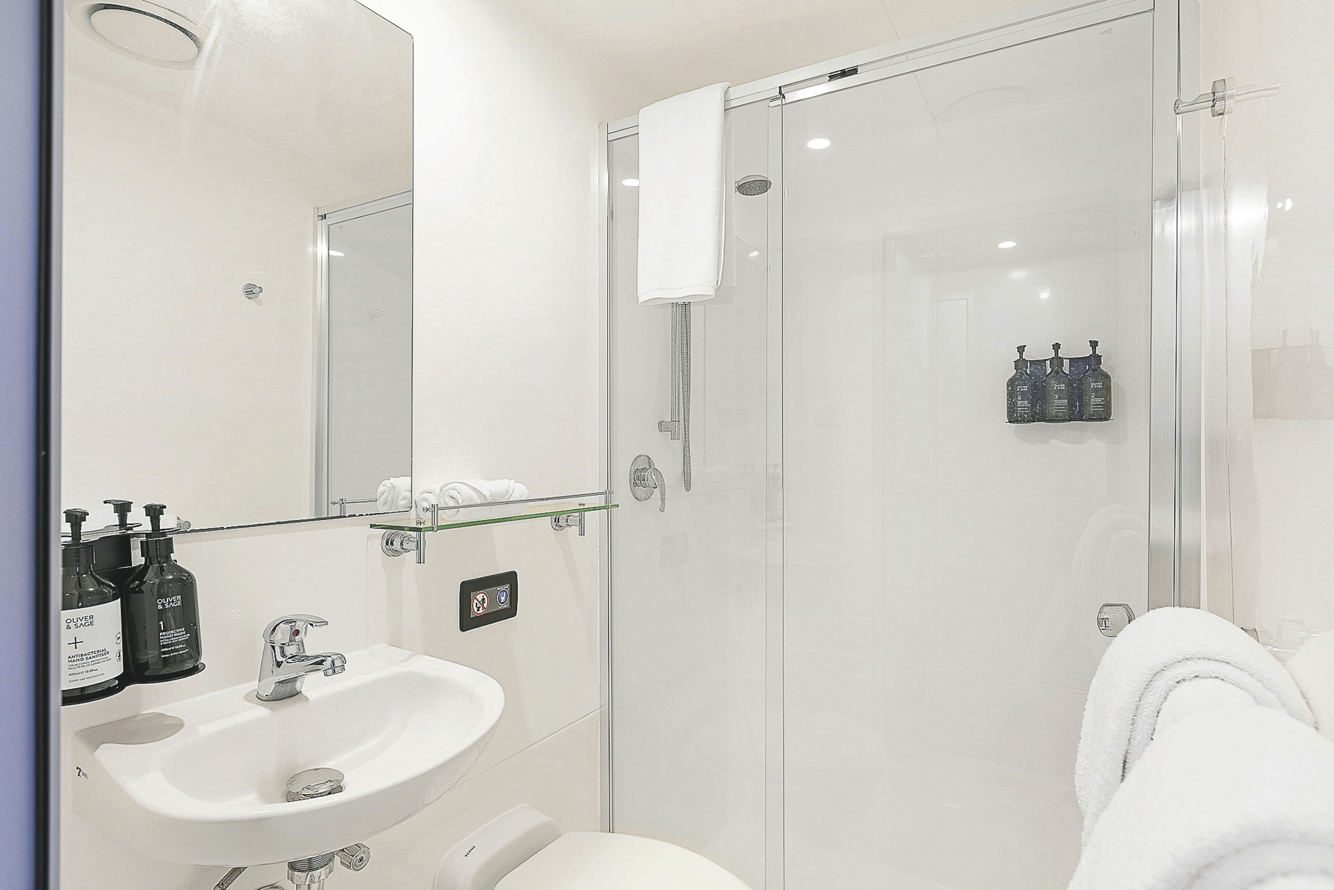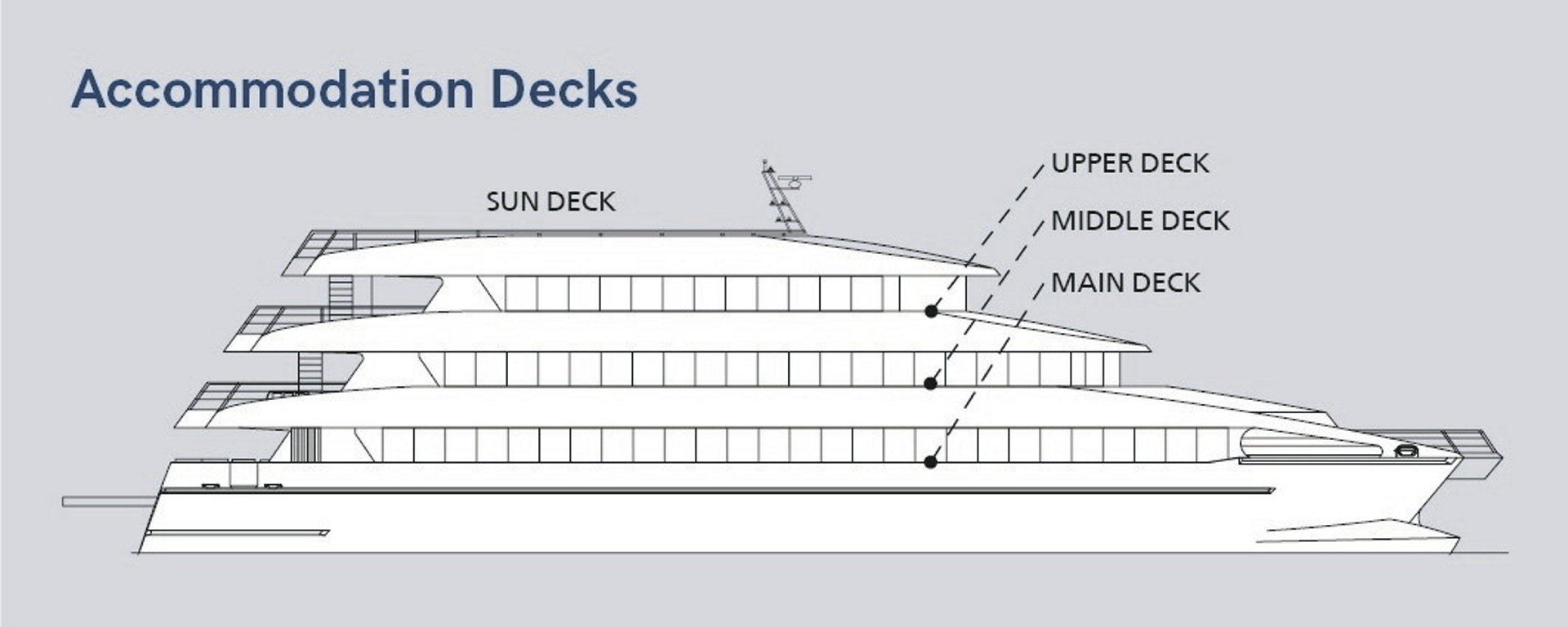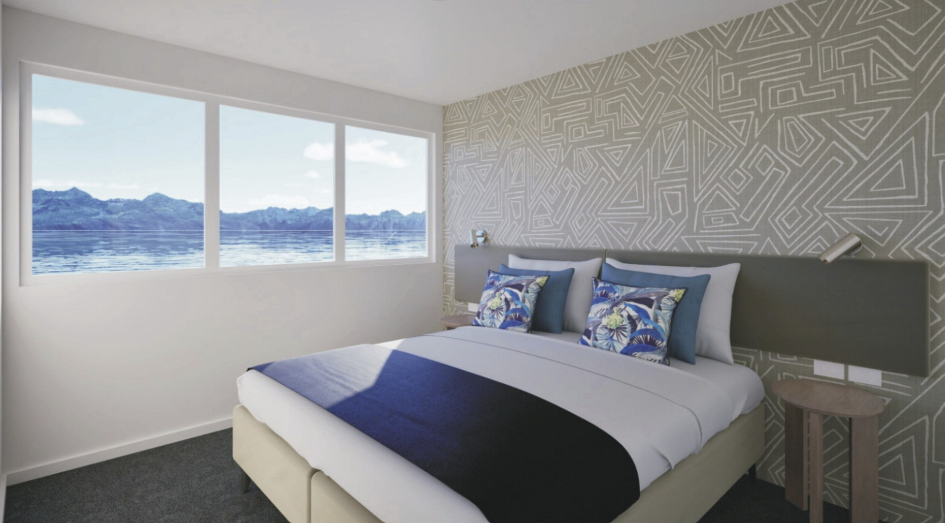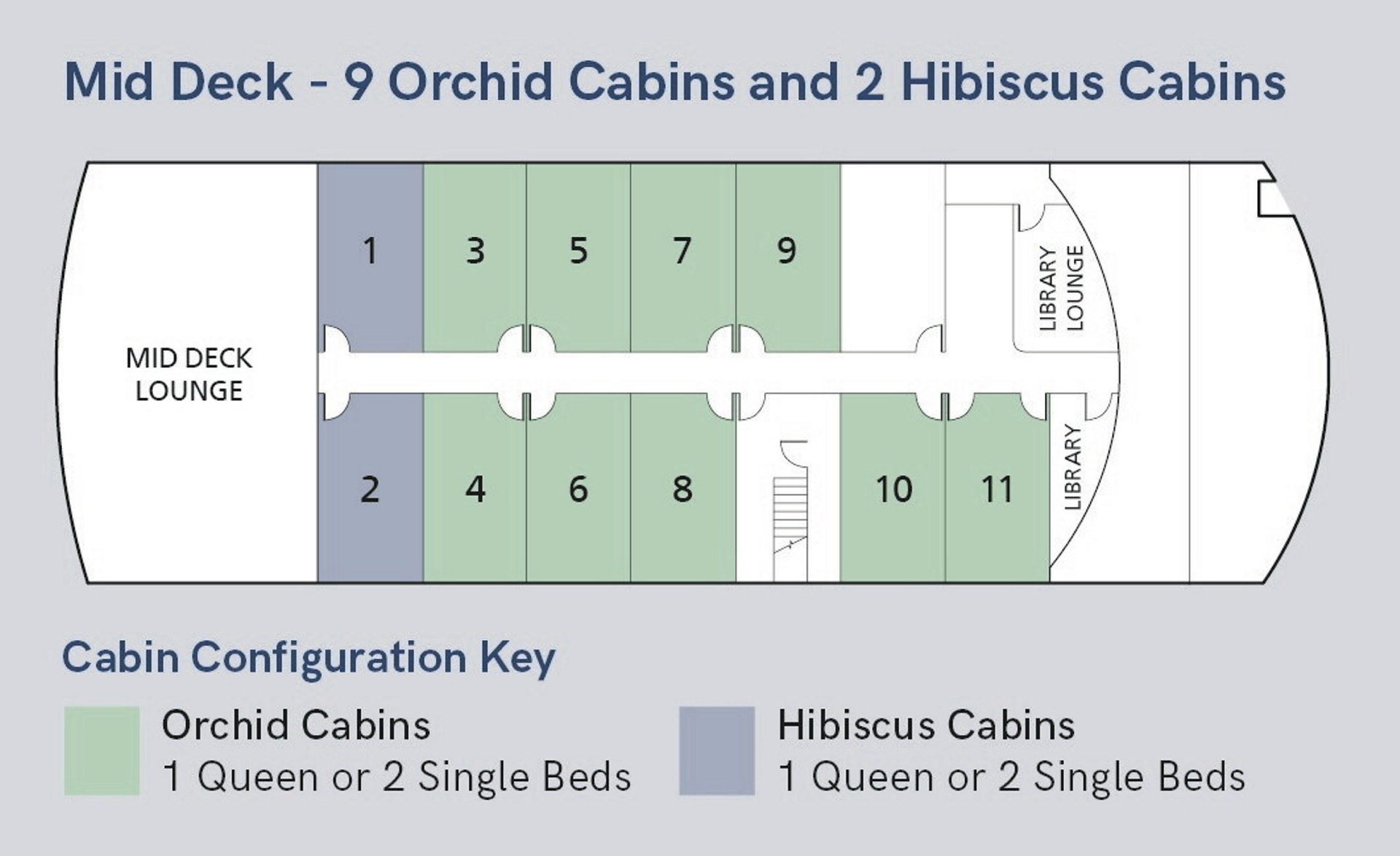 Orchid-Deck (obere Decks): 28 Kabinen, ca. 13 m², mit Klimaanlage, privatem Bad, Fön, TV/DVD und großem Fenster mit Meerblick, 1 Doppelbett oder 2 Einzelbetten, Nespresso Maschine, Minibar kostenlos