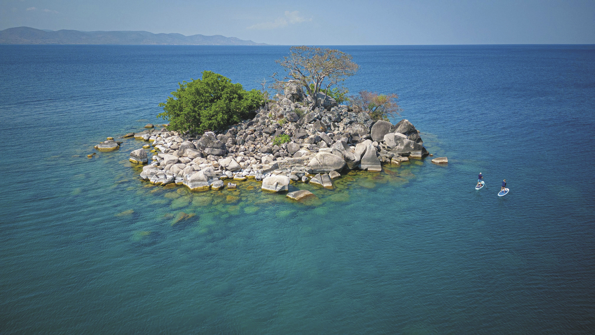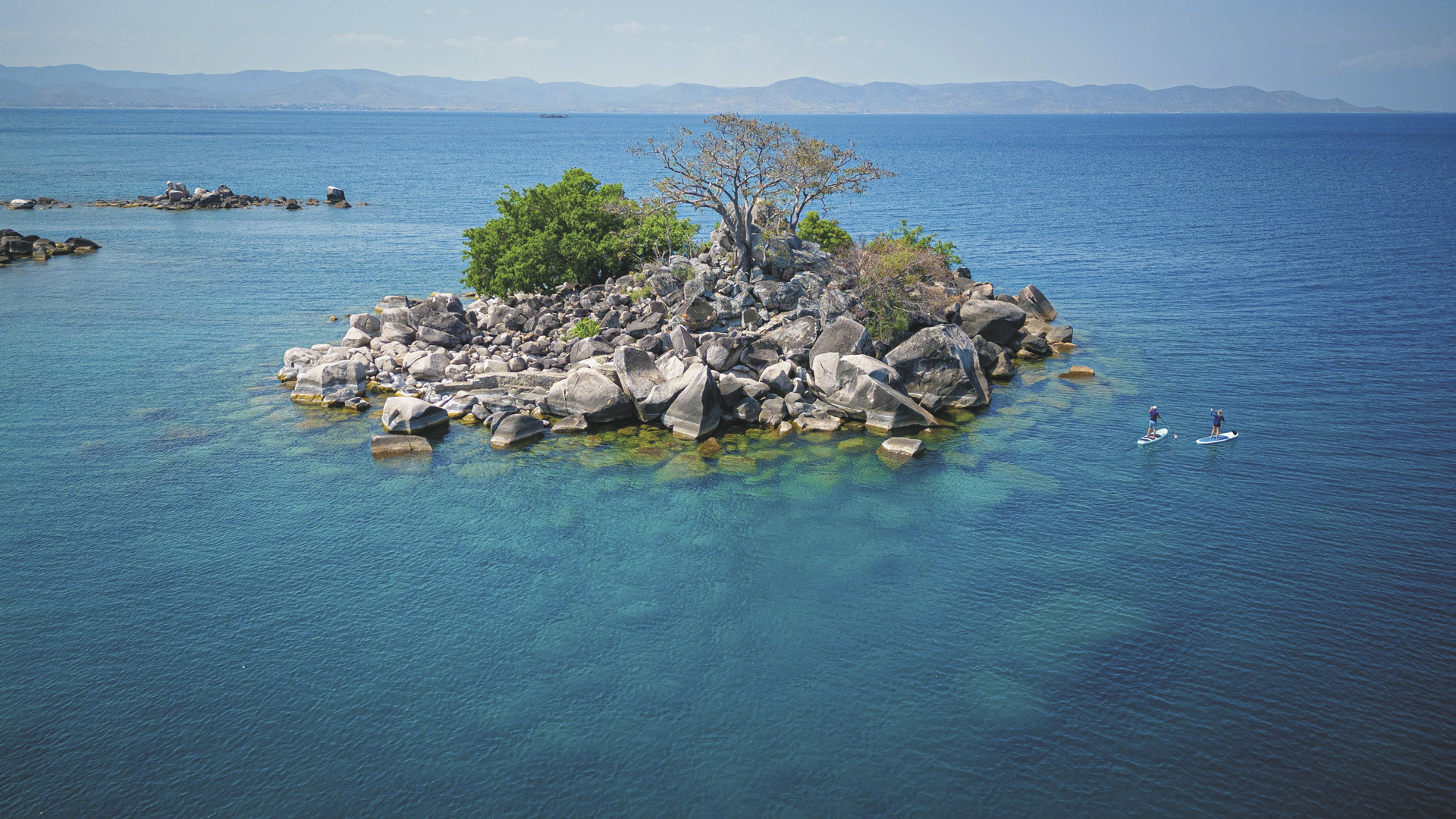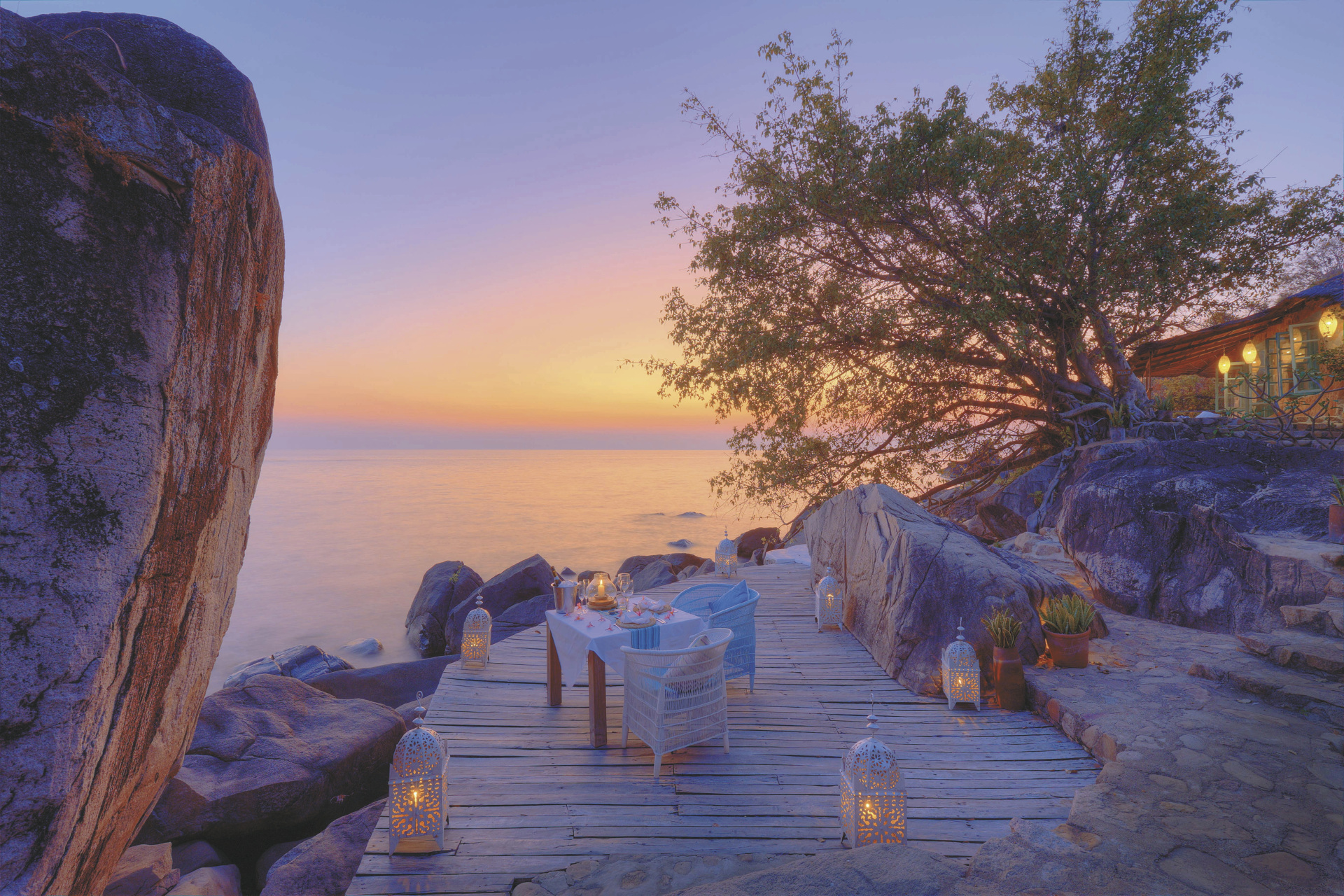 Eingebettet zwischen Granitfelsen liegt der zentrale Bereich der Lodge. Hier finden Sie das Restaurant, die Lounge und auch den Barbereich und immer einen Blick auf das azurblaue Wasser des großen afrikanischen Süßwassersees. Genießen Sie erstklassige Mahlzeiten, die entspannte Atmosphäre und lassen Sie sich im Spa verwöhnen. Ein Ort zum Seele baumeln lassen! Eingeschlossene Aktivitäten: Segeln, Kajaken, Schnorcheln, SUP, E-Bike Touren, geführte Tour durch den Gemüsegarten. Optionale Aktivitäten: Tauchen, Wasserski fahren, Bootsausflüge, Besuch der Katundu Handwerksstätte und der St. Peters´s Kathedrale.