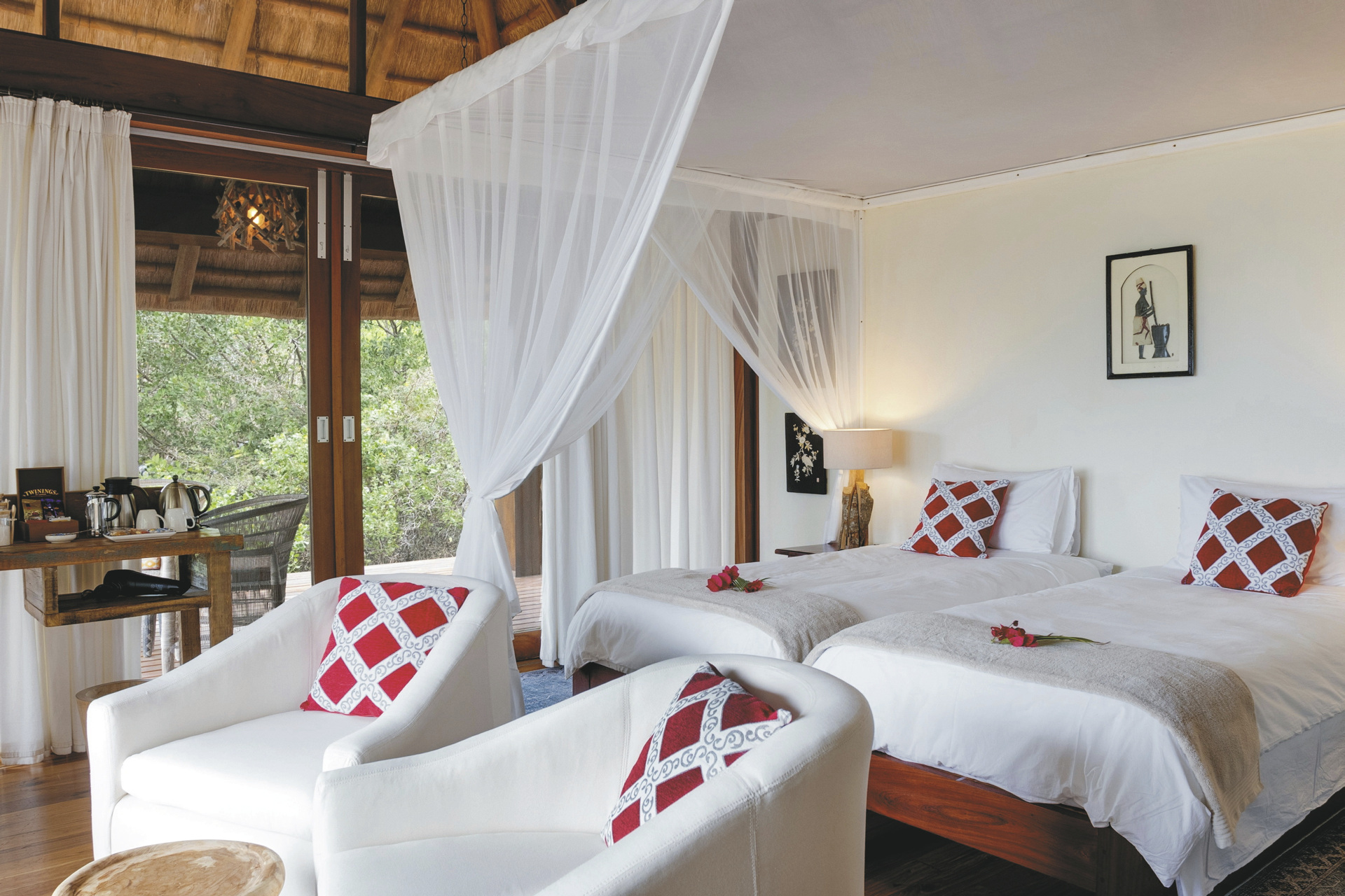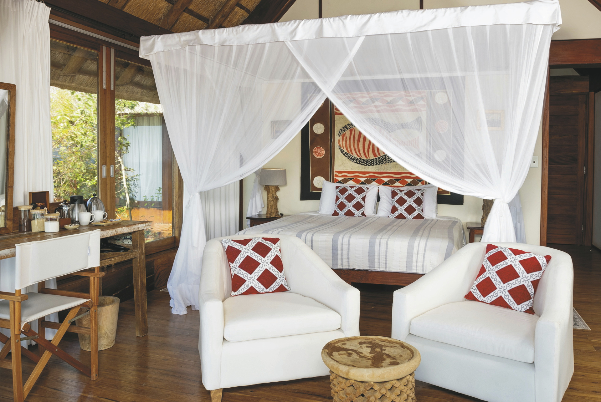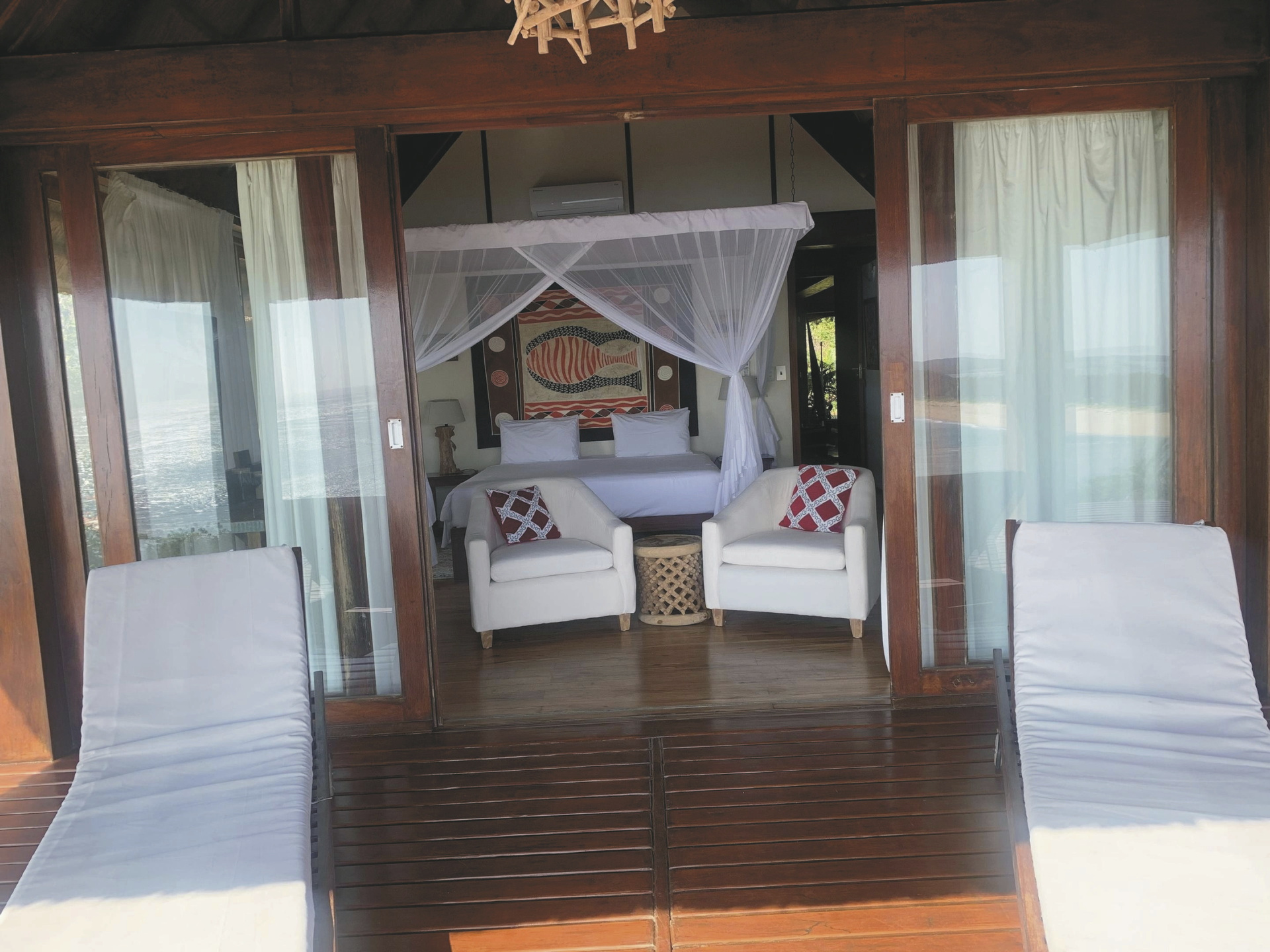 Die 3 riedgedeckten Suiten bieten besten Panoramablick auf das Meer und die kleine Insel Inhaca und sind klassisch im Mozambique-Stil eingerichtet. Ausgestattet sind sie mit einem eigenen Bad, Moskitonetz, kostenlosem WLAN, Safe, Minibar, Tee-/Kaffeezubereiter, Klimaanlage, Fön und überdachter Terrasse. Für Familien gibt es die Möglichkeit ein weiteres Schlafzimmer für die Kinder bei gemeinsamer Badezimmernutzung hinzu zu buchen.