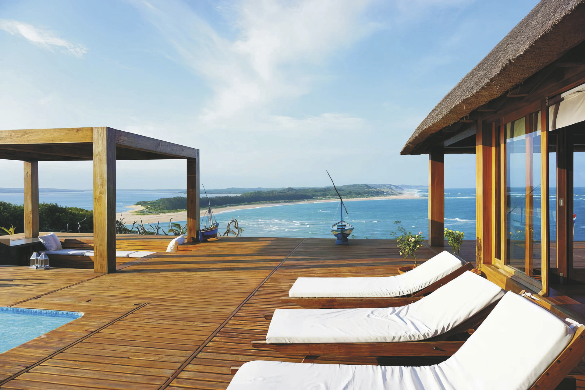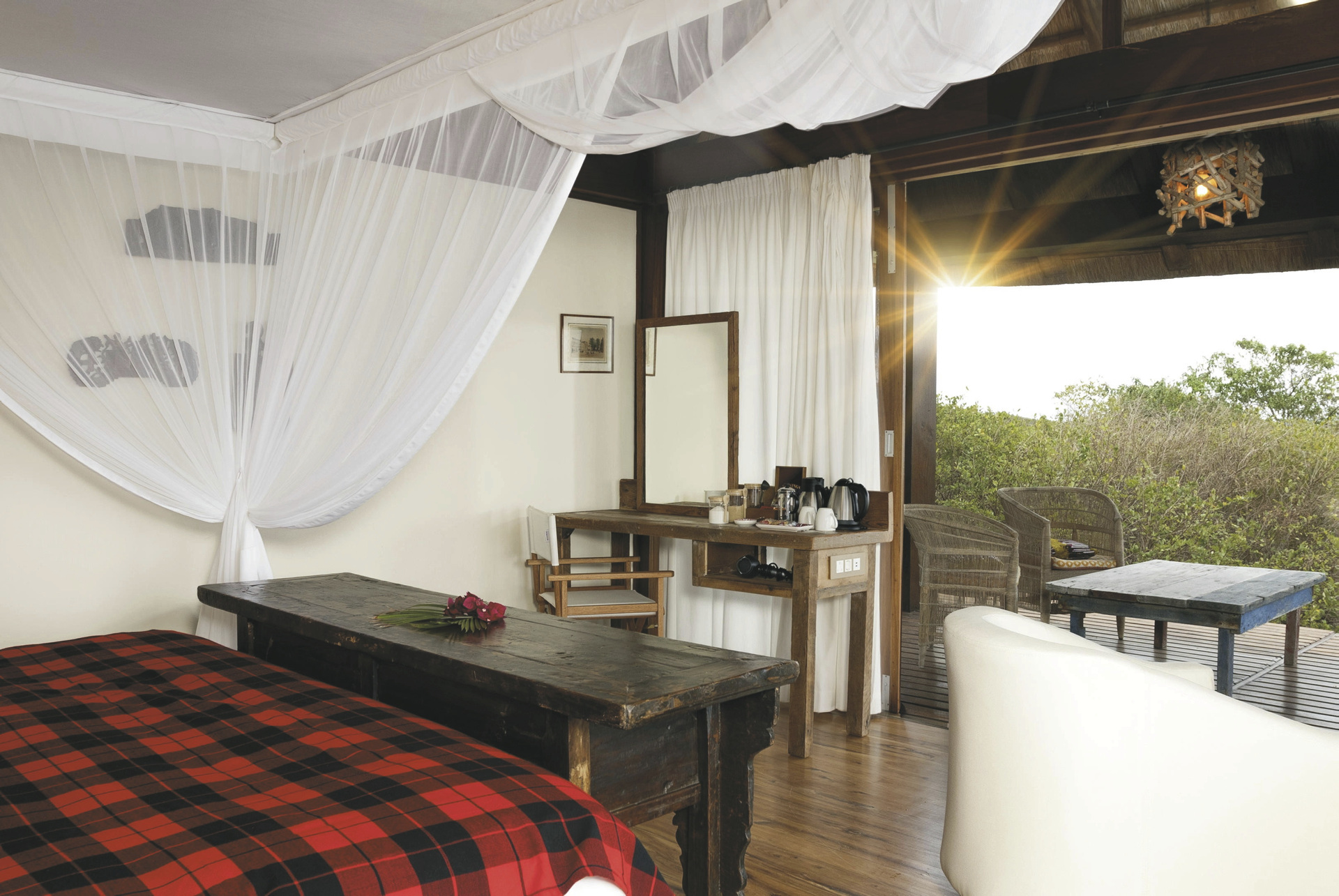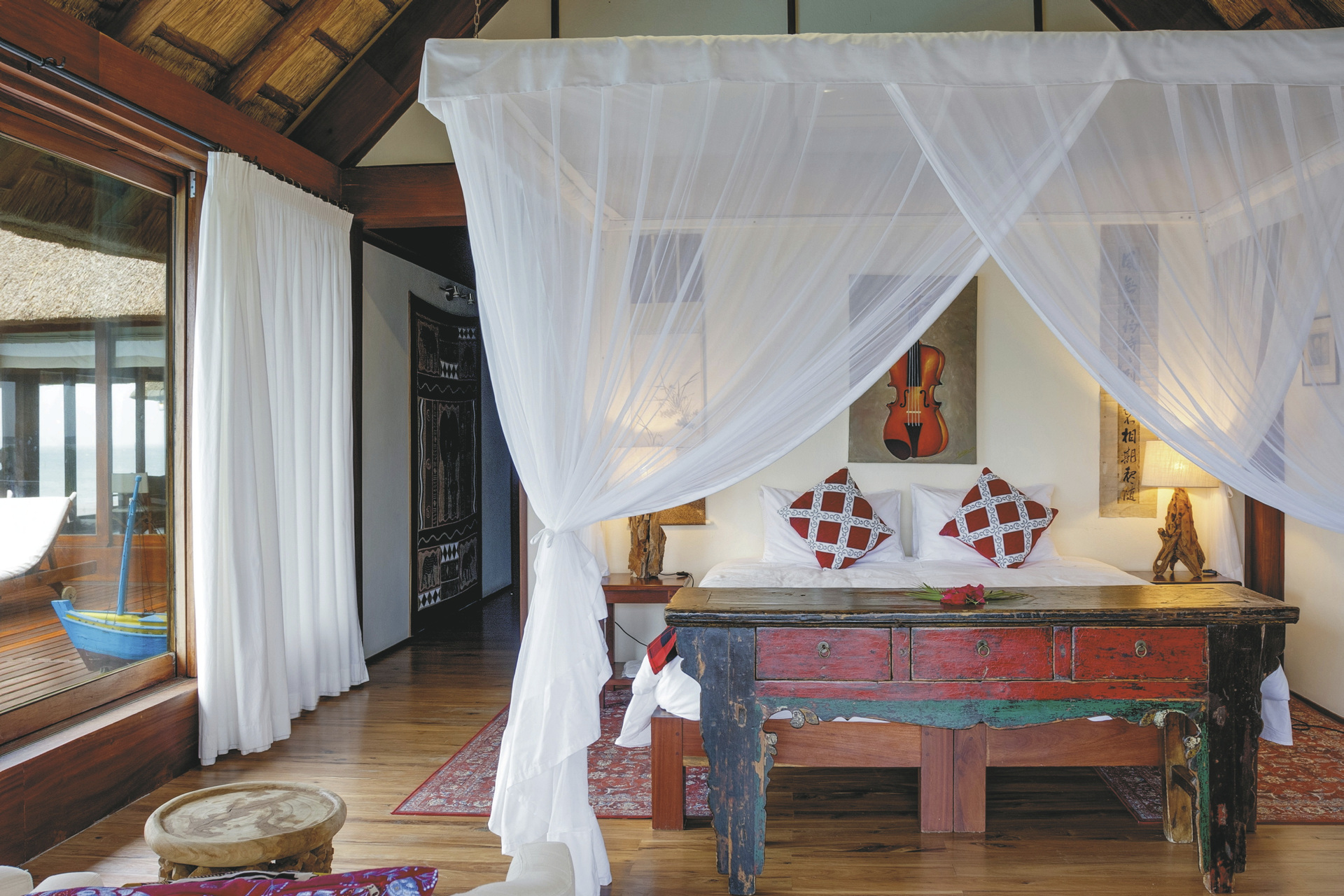 Die 3 riedgedeckten Suiten bieten besten Panoramablick auf das Meer und die kleine Insel Inhaca und sind klassisch im Mozambique-Stil eingerichtet. Ausgestattet sind sie mit einem eigenen Bad, Moskitonetz, kostenlosem WLAN, Safe, Minibar, Tee-/Kaffeezubereiter, Klimaanlage, Fön und überdachter Terrasse. Für Familien gibt es die Möglichkeit ein weiteres Schlafzimmer für die Kinder bei gemeinsamer Badezimmernutzung hinzu zu buchen.