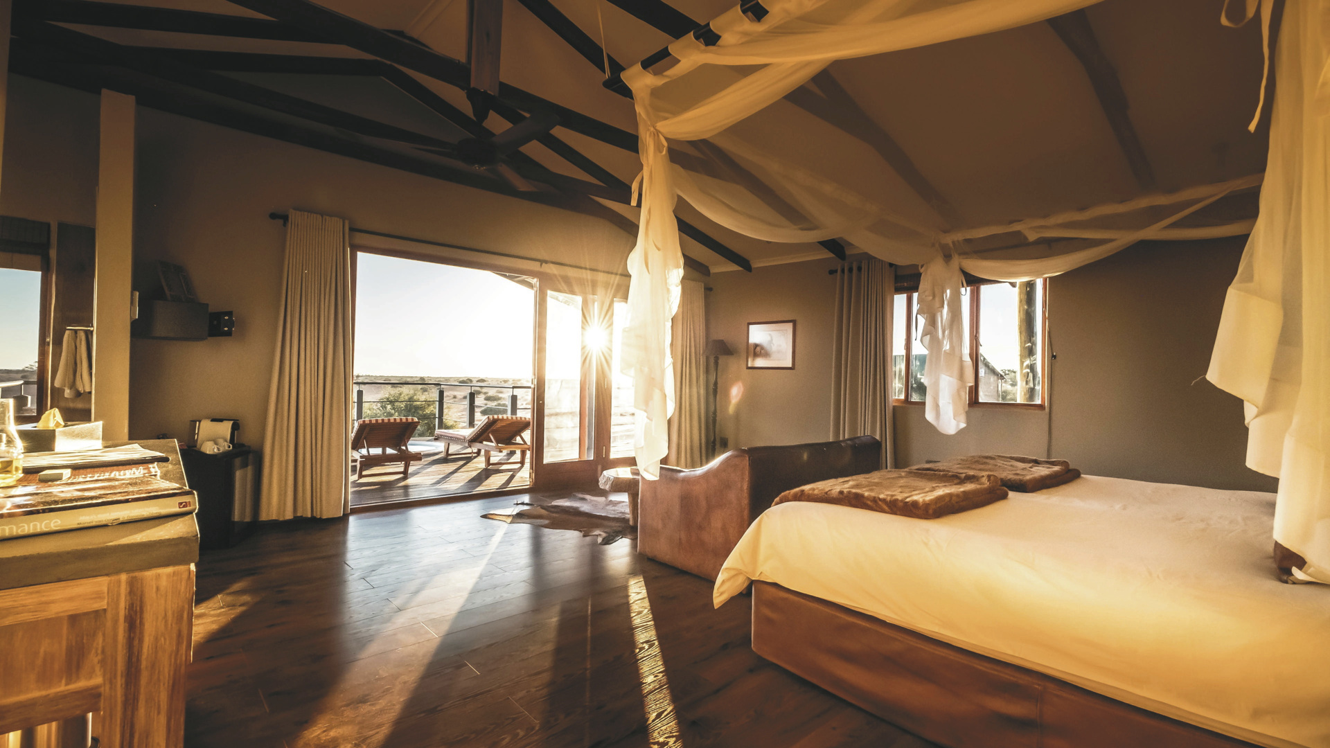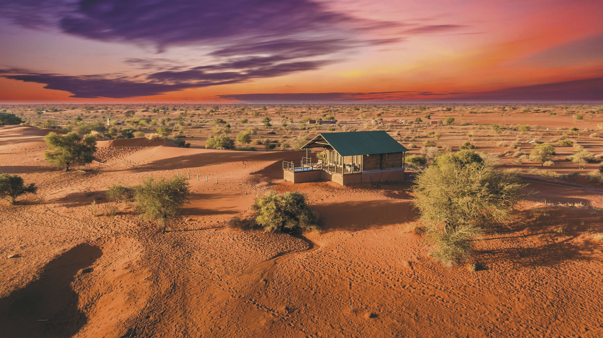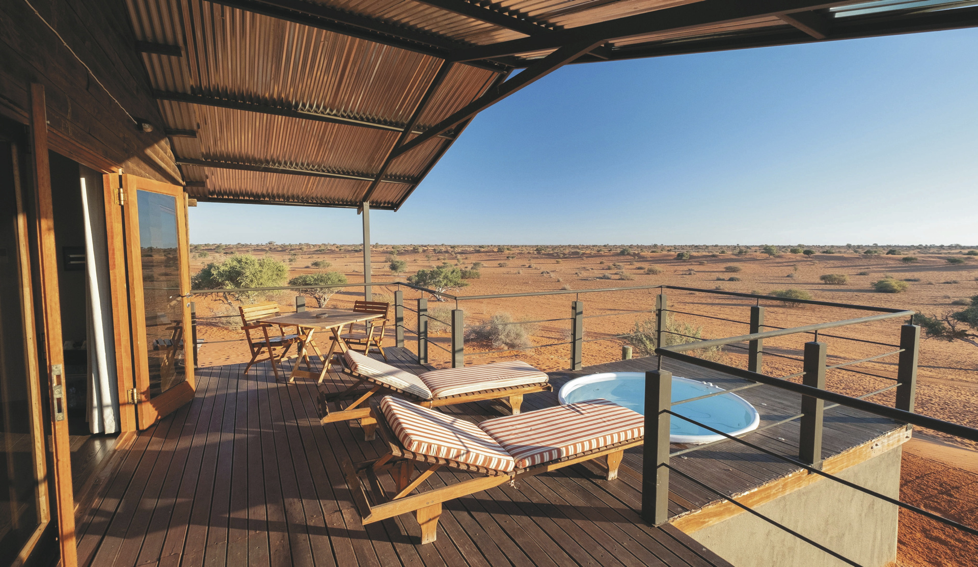 Im alten Farmhaus befinden sich das Restaurant mit Terrasse, die Lounge mit Kamin und WLAN, die Bar, eine kleine Bibliothek und der Weinkeller. Im Garten entspannen Sie am Pool und die Lapa ist der Platz für ein gemütliches Beisammensein und Abendessen mit Lagerfeuerromantik. Überdachter Parkplatz vorhanden. Erleben Sie die Kalahari von ihrer schönsten Seite bei einem Spa-Besuch oder verschiedenen optionalen Aktivitäten: geführte Wanderungen mit den San, Panorama- und Sundowner-Fahrten, geführte Reitsafaris, Sternenbeobachtung mit dem computergesteuerten Teleskop, Besuch der Geparden aus dem Cheetah Conservation Fund.