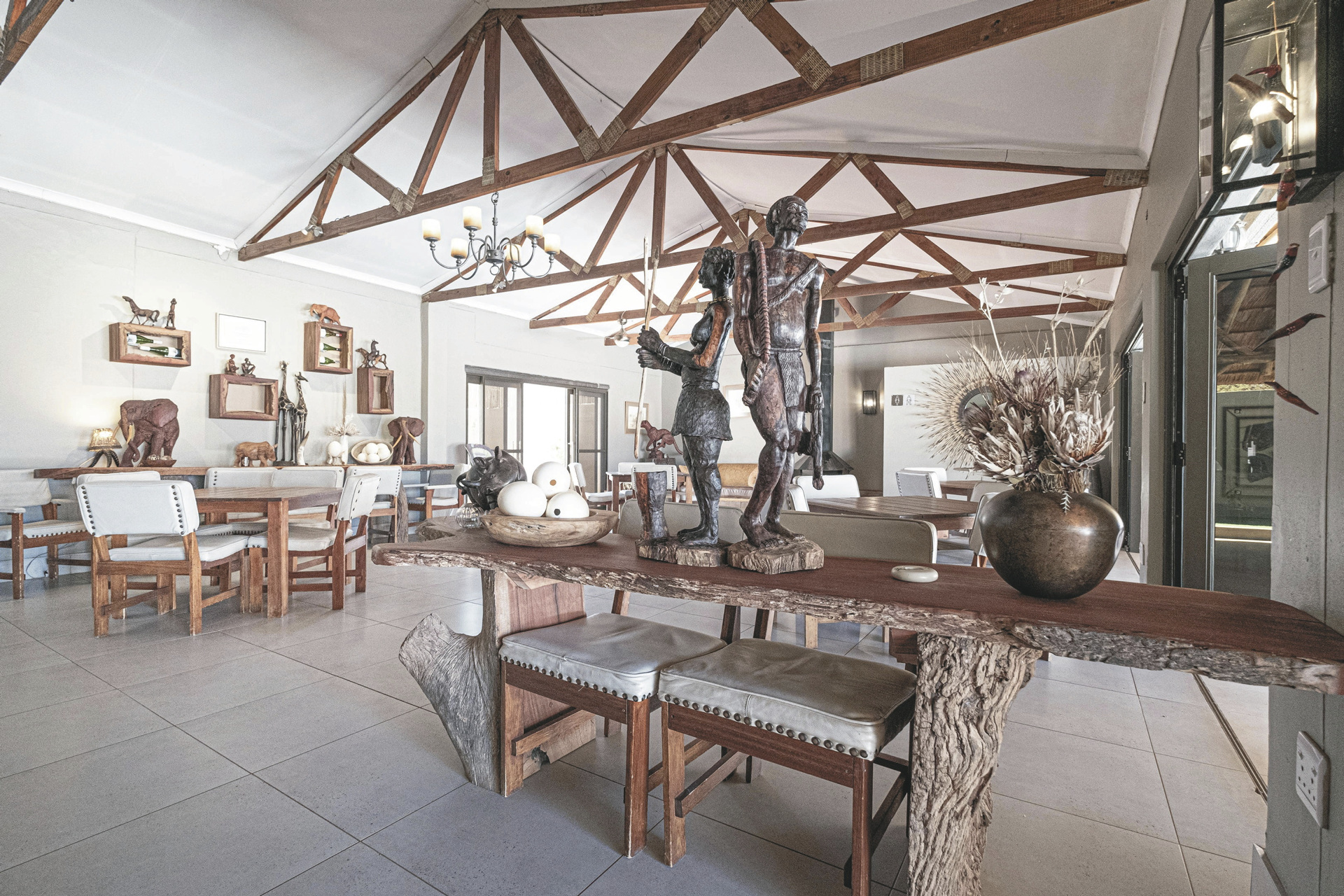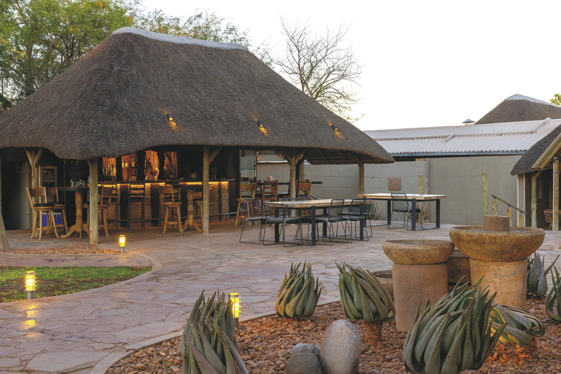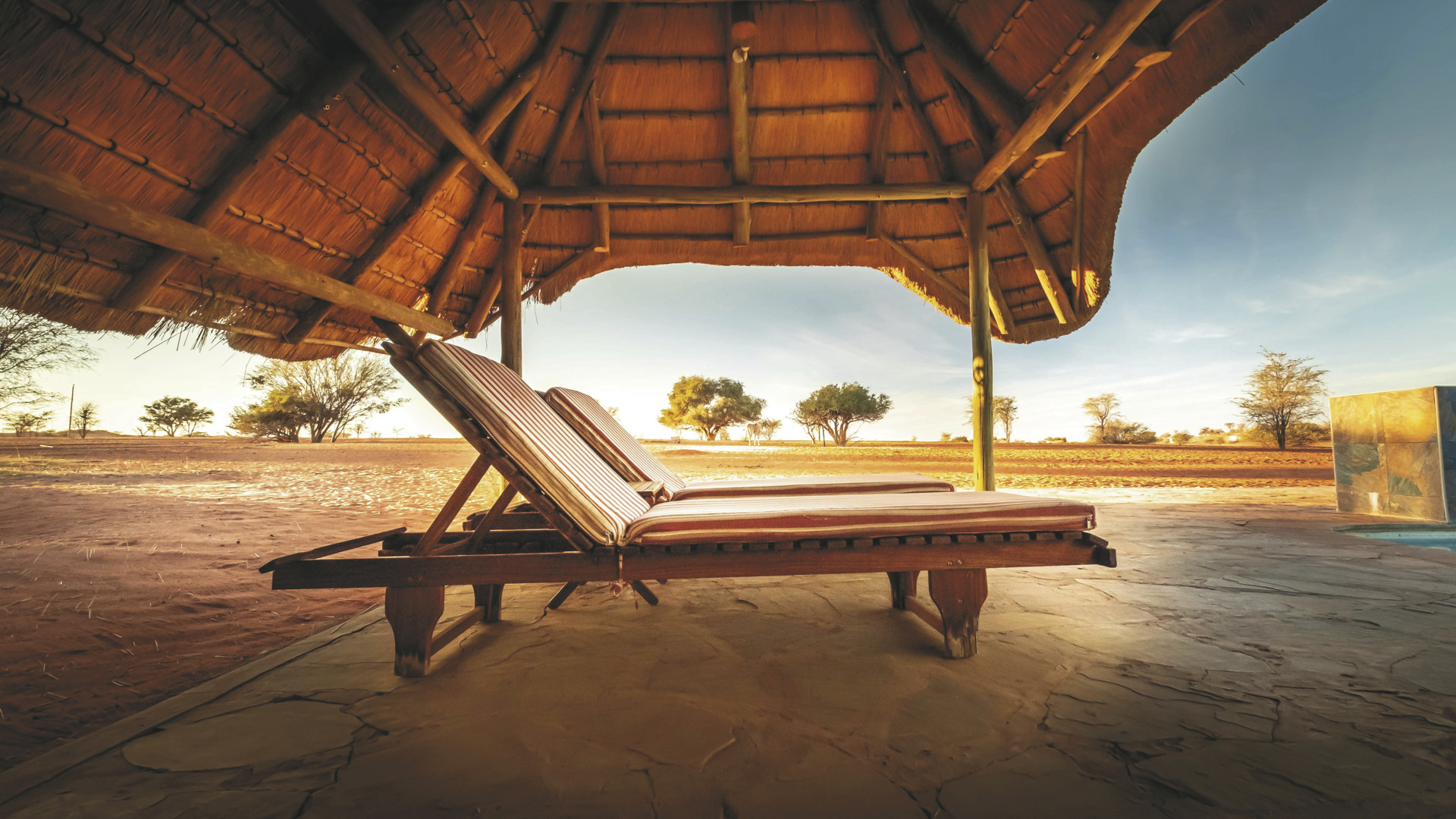 Im alten Farmhaus befinden sich das Restaurant mit Terrasse, die Lounge mit Kamin und WLAN, die Bar, eine kleine Bibliothek und der Weinkeller. Im Garten entspannen Sie am Pool und die Lapa ist der Platz für ein gemütliches Beisammensein und Abendessen mit Lagerfeuerromantik. Überdachter Parkplatz vorhanden. Erleben Sie die Kalahari von ihrer schönsten Seite bei einem Spa-Besuch oder verschiedenen optionalen Aktivitäten: geführte Wanderungen mit den San, Panorama- und Sundowner-Fahrten, geführte Reitsafaris, Sternenbeobachtung mit dem computergesteuerten Teleskop, Besuch der Geparden aus dem Cheetah Conservation Fund.