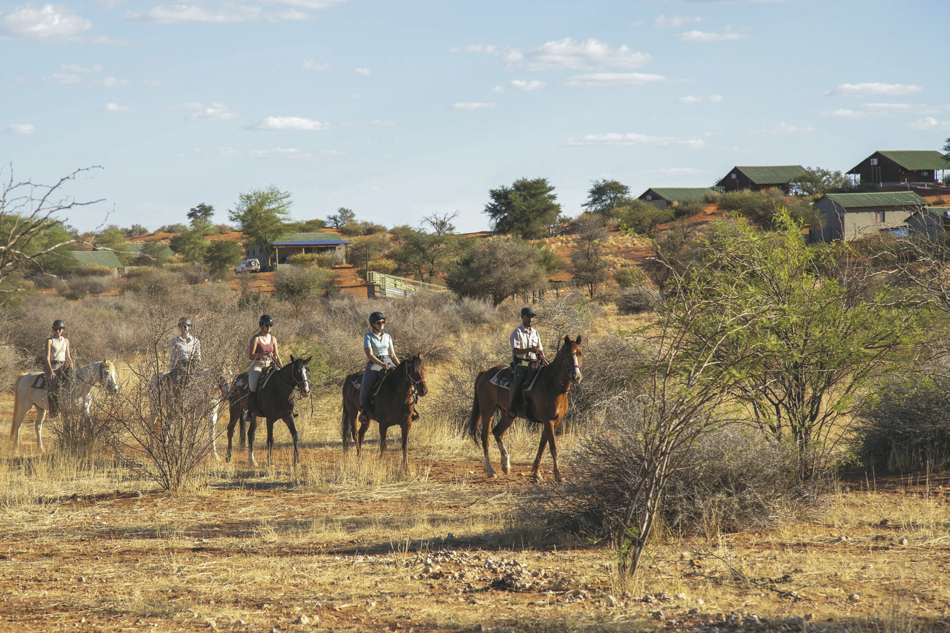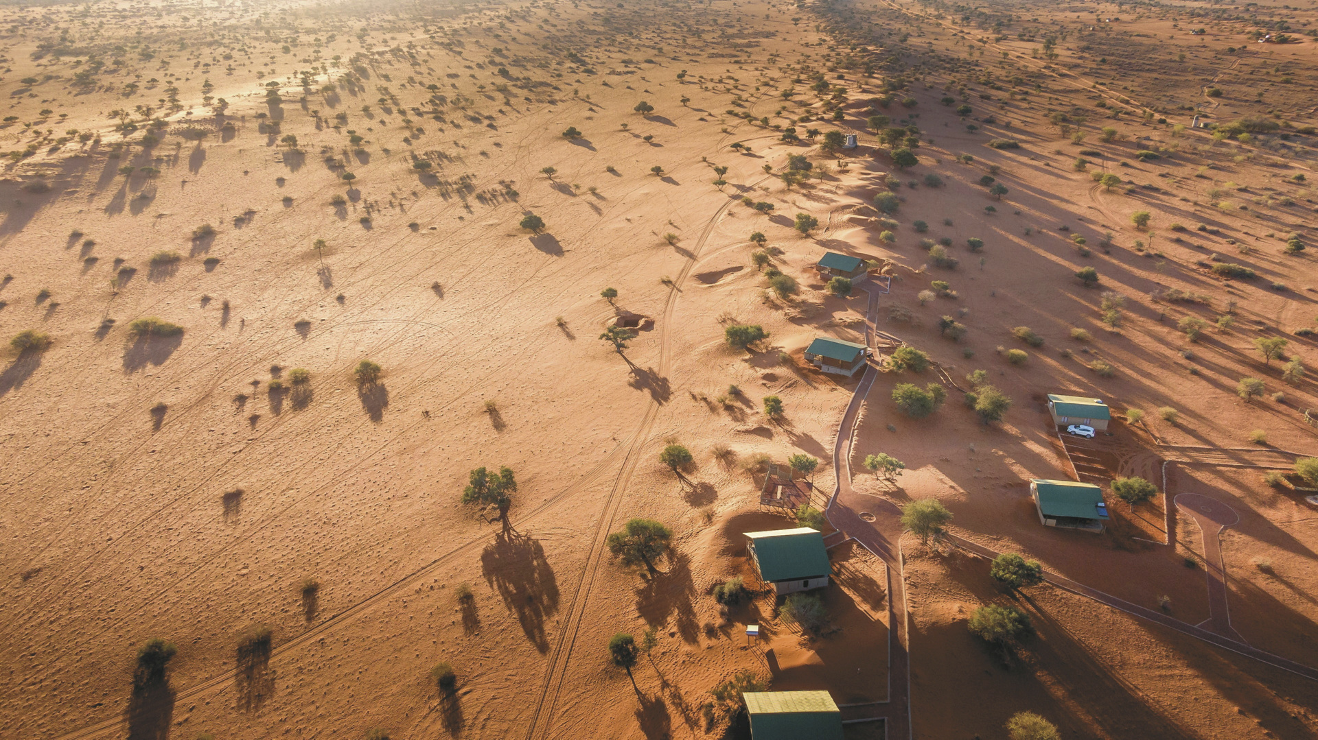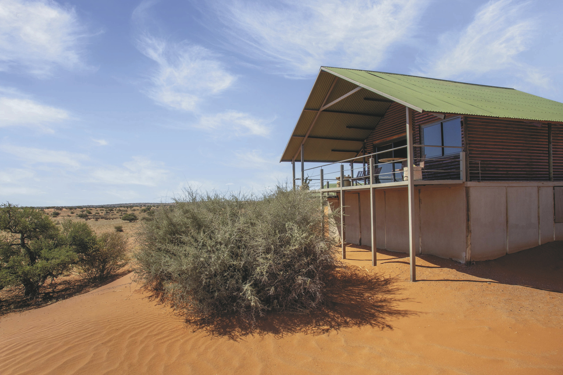 Die 4 großzügigen Dune Chalets mit atemberaubender Aussicht in die Kalahari liegen oben auf einer Dünen, ebenso die 2 Exclusive Chalets. Diese haben jedoch zusätzlich einen privaten Plunge Pool. Die 8 Savannah Chalets befinden sich im Tal zwischen den Dünen, 2 davon sind für Familien geeignet. Im Haupthaus befinden sich 6 kleinere Standardzimmer im afrikanischen Kolonialstil. Alle Zimmer und Chalets mit eigenem Bad, Klimaanlage, Ventilator, Fön, Moskitonetz, Safe, Minibar/Kühlschrank, Tee-/Kaffeezubereiter und Terrasse oder Balkon.