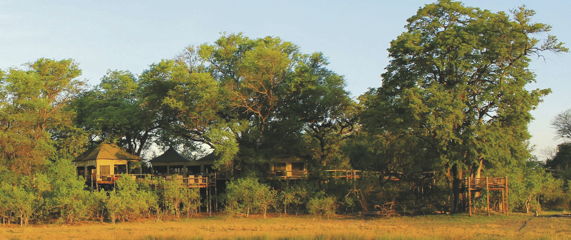 Hoch über dem Boden erreichen Sie über Holzstege Ihr Heim auf Zeit in rund 5 m Höhe auf Holzplattformen. Die 10 geräumigen und exquisiten Safarizelte sind geschmackvoll in natürlichen Farben dekoriert. Jedes verfügt über eine großzügige Lounge, ein offenes, modernes und helles Bad sowie Safe, Fön, Ventilator, Moskitonetz und eine große Terrasse mit traumhafter Aussicht auf die Überflutungsgebiete des Kwando Flusses.