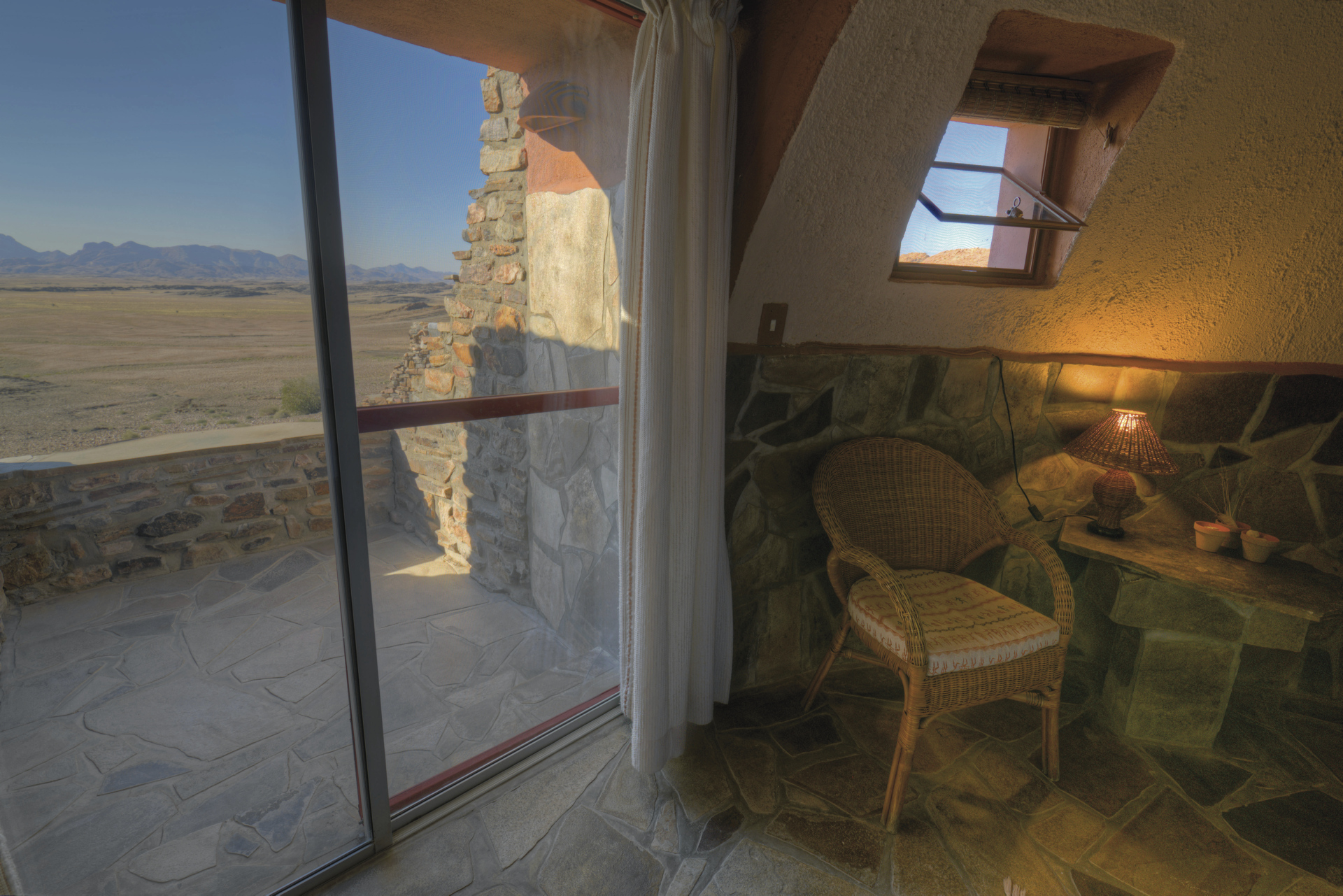 Rustikale Lodge auf einer Anhöhe mit grandiosem Blick über die Namib Wüste und die Rotstock Berge, einem Wanderparadies. Das einzige Ritz der Welt, das von Felsen und Wüste umgeben ist.