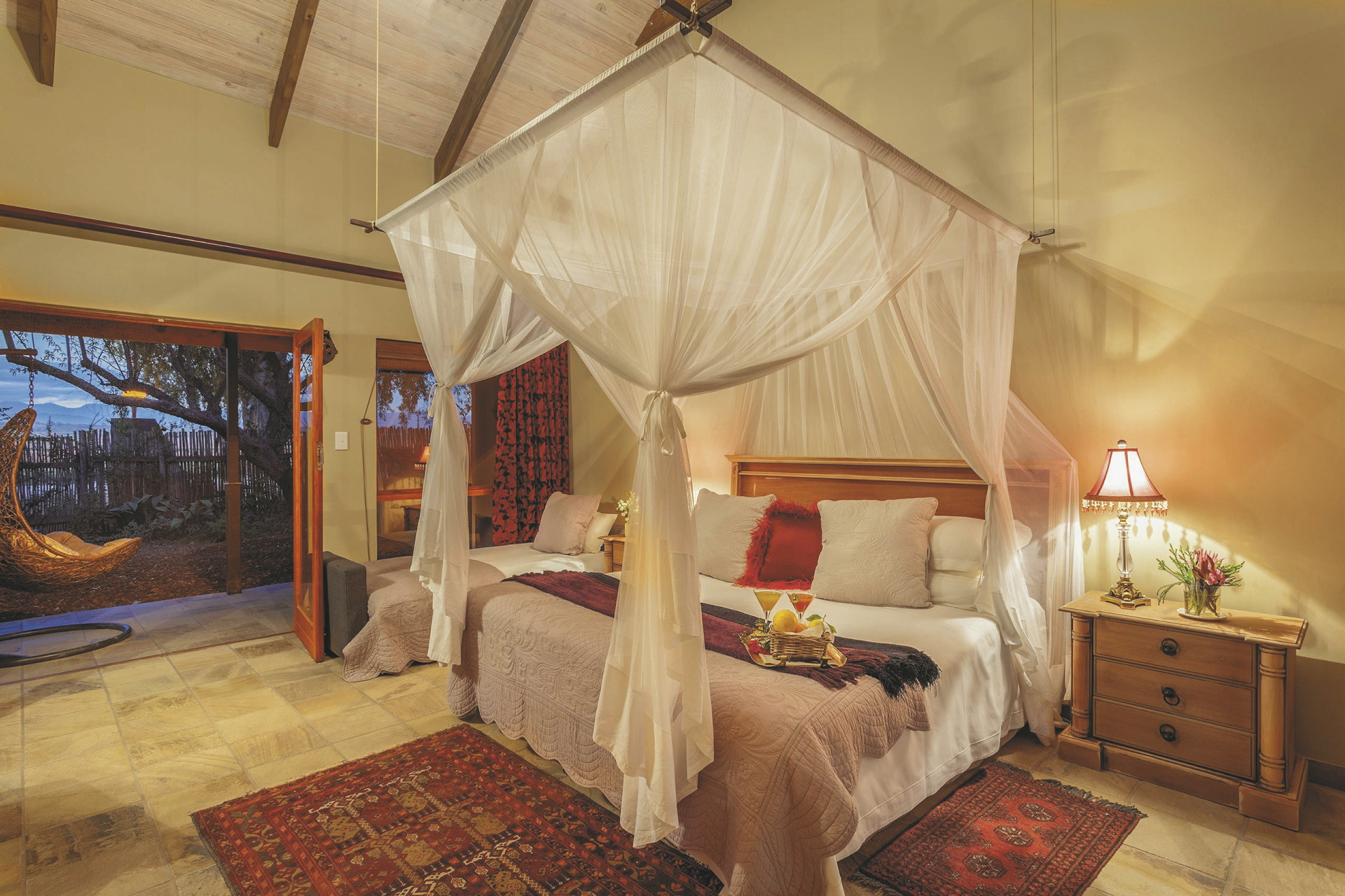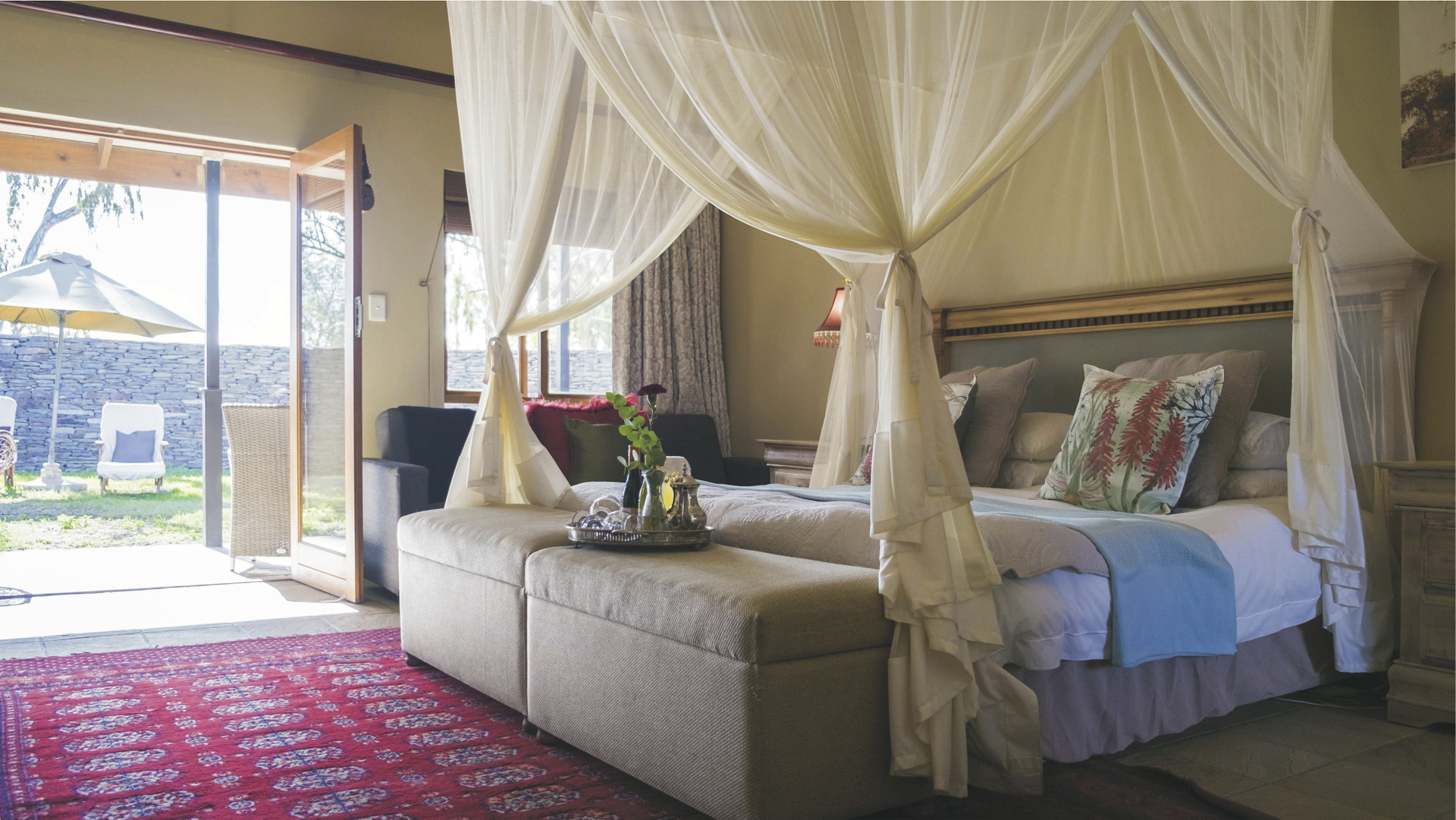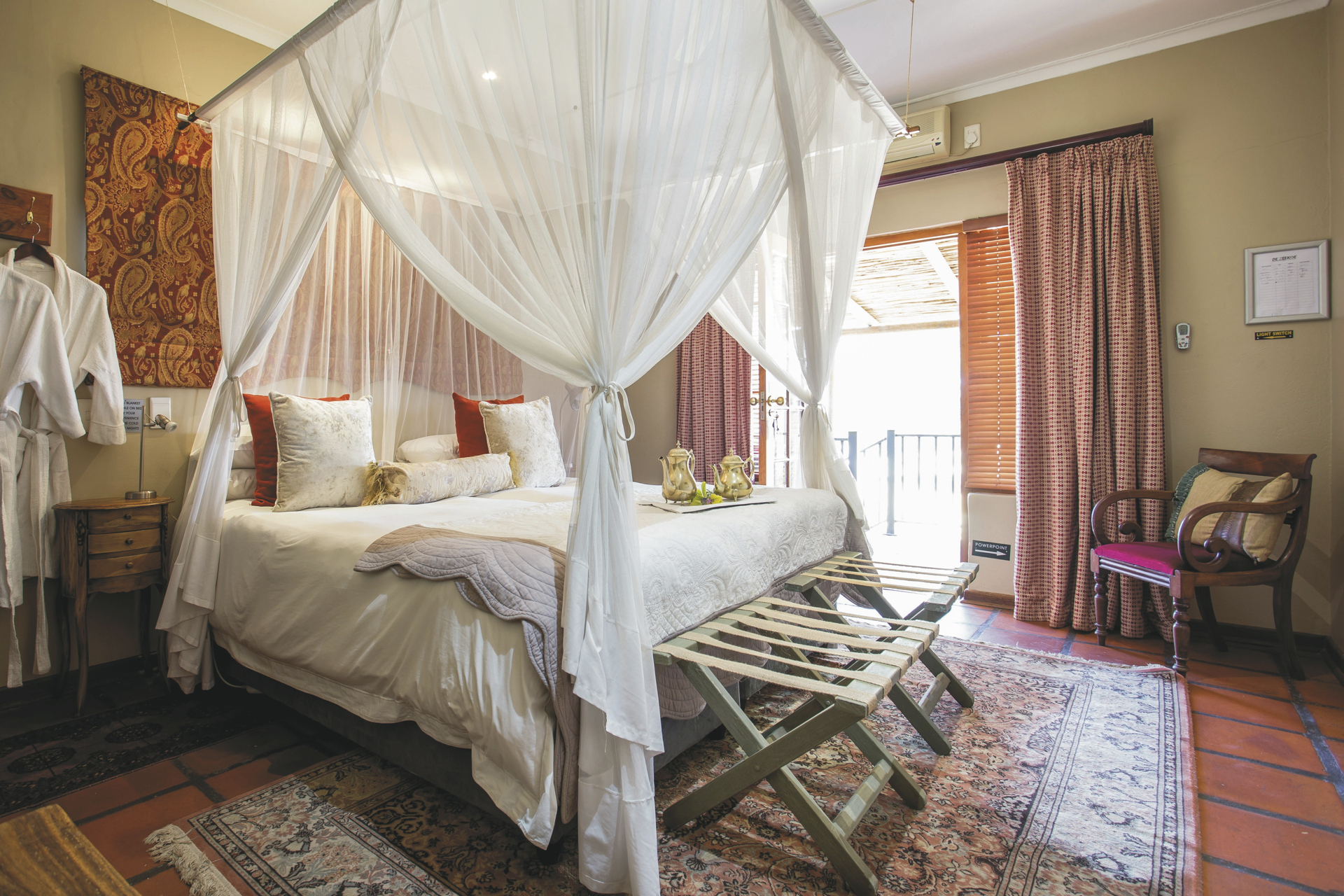 Die 24 individuell eingerichteten Zimmer versprühen einen charmanten Farmcharakter. Sie befinden sich in verschiedenen Gebäuden und unterscheiden sich durch den Ausblick und die Größe voneinander. Jedes hat ein eigenes, teils offenes Badezimmer, außerdem einen Fön, Klimaanlage, Safe, Kühlschrank, WLAN, Tee-/Kaffeezubereiter, TV, Moskitonetz; einige Zimmer haben einen Kamin.