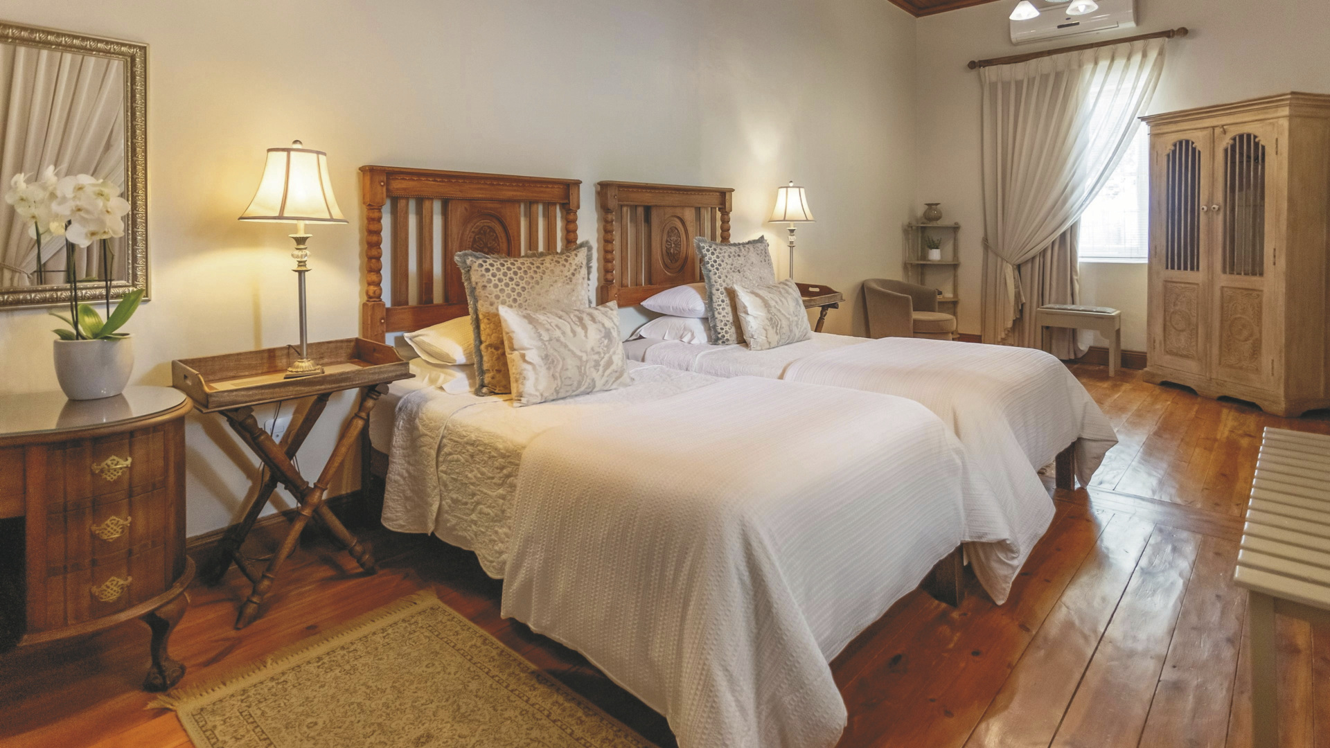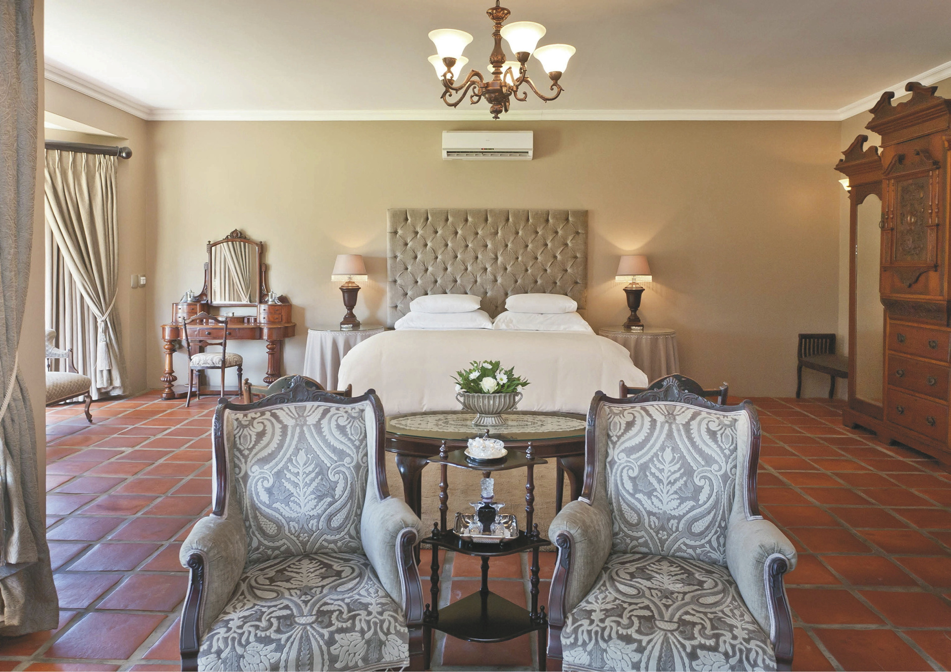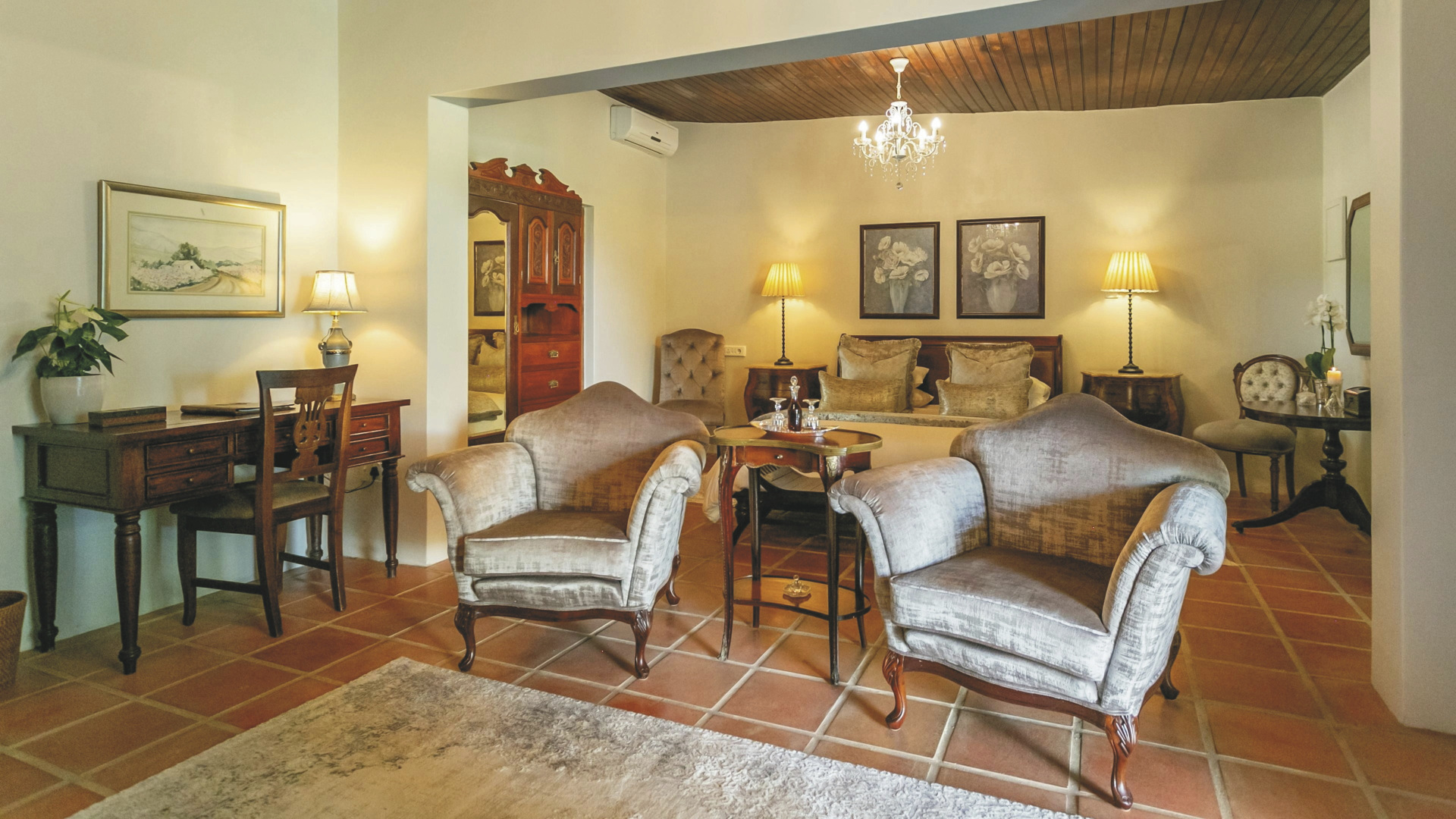 Es gibt 19 geräumige Suiten, die individuell mit Antiquitäten möblierte sind. Alle verfügen natürlich über ein eigenes Bad, außerdem einen Loungebereich, Fön, Klimaanlage, Minibar, TV, kostenloses WLAN, Safe, Tee-/Kaffeezubereiter und eine Terrasse. Für Familien gibt zum einem die Plumes Villa mit 2 Schlafräumen, einer gemeinsamen Lounge und einer Terrasse, direkt neben dem Haupthaus. Zum anderen, die auf der gegenüberliegenden Straßenseite befindliche La Ferme Villa, welche ebenfalls über 2 Schlafräume verfügt aber außerdem noch einen eigenen Pool bietet, bestens auch für 2 gemeinsam reisende Paare geeignet.