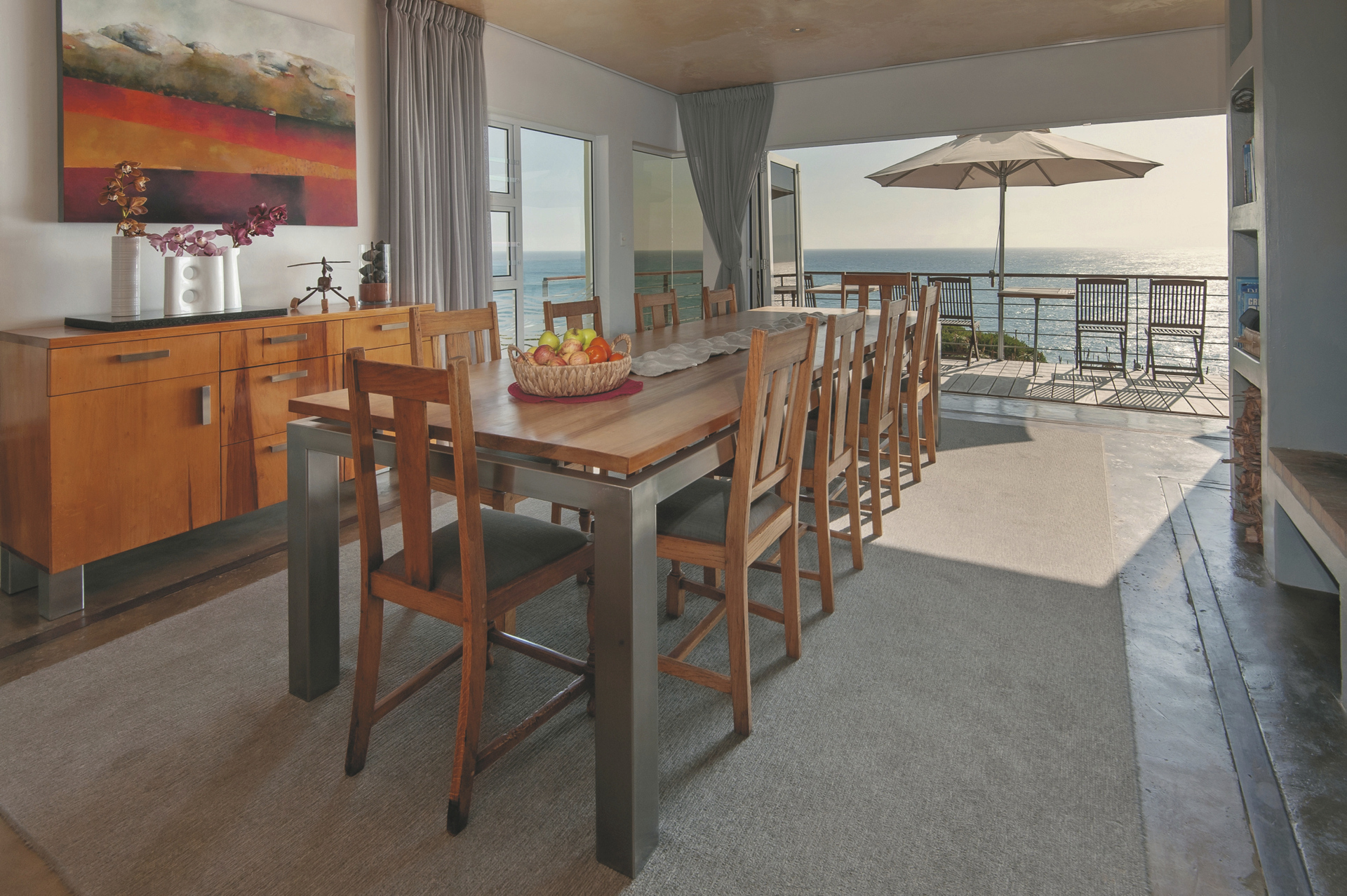Die kleine, gemütliche Lodge bietet ein familiäres Ambiente, liebevoll im afrikanisch-maritimen Stil eingerichtet, in dem Sie sich gleich wohlfühlen werden. Schon morgens beim Frühstück auf der Terrasse oder im lichtdurchfluteten Speisezimmer haben Sie das Rauschen der Wellen im Ohr und das Glitzern des Meeres im Blick. Im zentralen Bereich finden Sie die Lounge, einen Kamin für kühle Winterabende, die Honesty-Bar und kostenloses WLAN. Von der großen Terrasse und dem kleinen Pool genießen Sie freien Meerblick, und das alles fast im Wohnzimmer der Wale. Der Küstenbereich vor der Lodge gehört zum Meeresschutzgebiet, Boote sind zur Freude der Wale hier nicht erlaubt, was spektakuläre Beobachtungen ermöglicht.