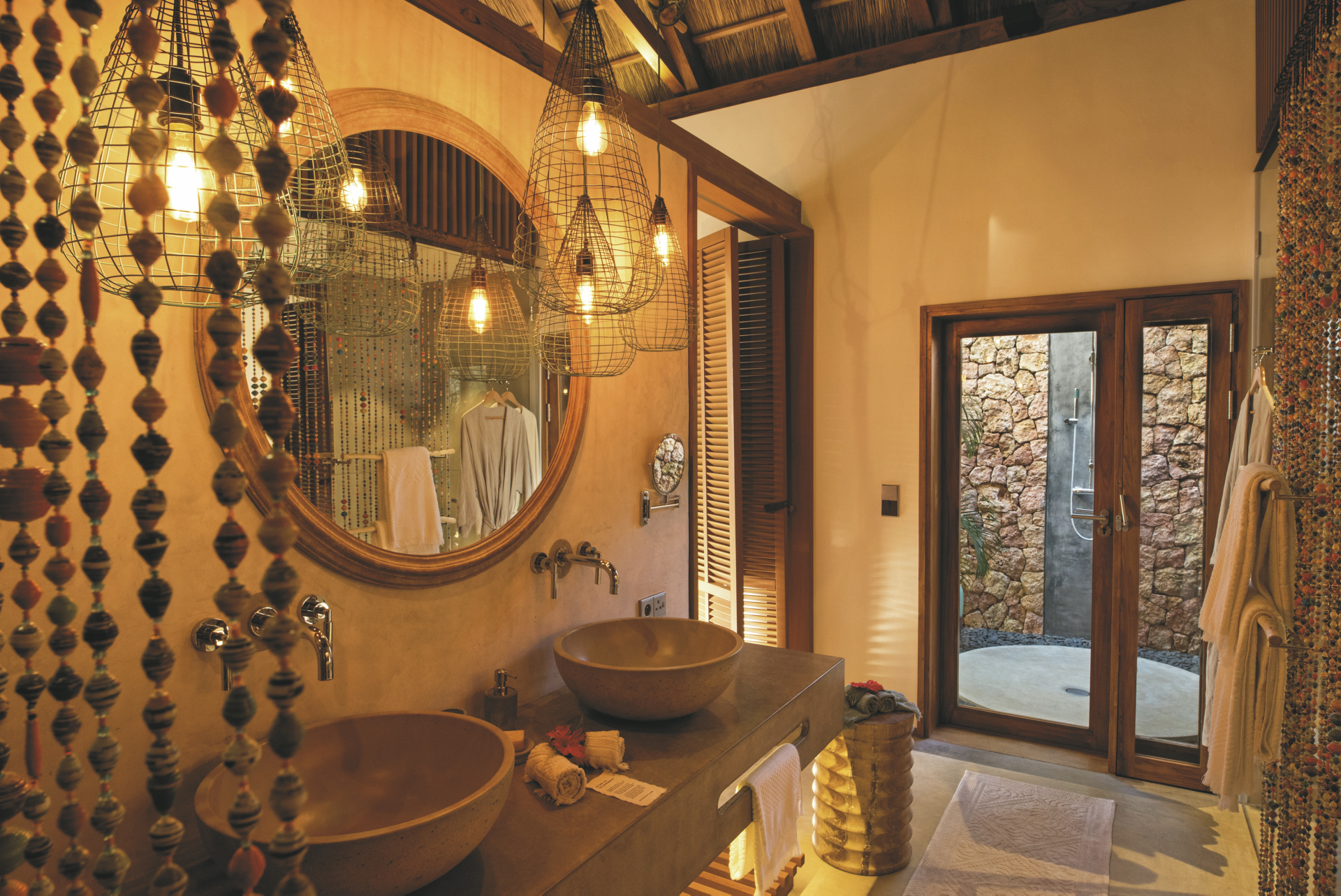 56 Unterkünfte verschiedener Kategorien inmitten des Gartens, die Komfort und zeitgenössisches Design mit traditionellen afrikanischen Akzenten verbinden. Die Bungalows (ca. 41 m²) verfügen über ein halboffenes Bad mit Dusche/WC, Klimaanlage, TV, Tee-/Kaffeezubereiter und eine Terrasse mit tropischer Außendusche. Der Jacuzzi-Bungalow hat einen eigenen Jacuzzi auf der Terrasse, die Jacuzzi-Suite und die Ocean Front-Suite sind sehr geräumig (ca. 132 m²) und haben einen Jacuzzi und einen Wohnbereich.