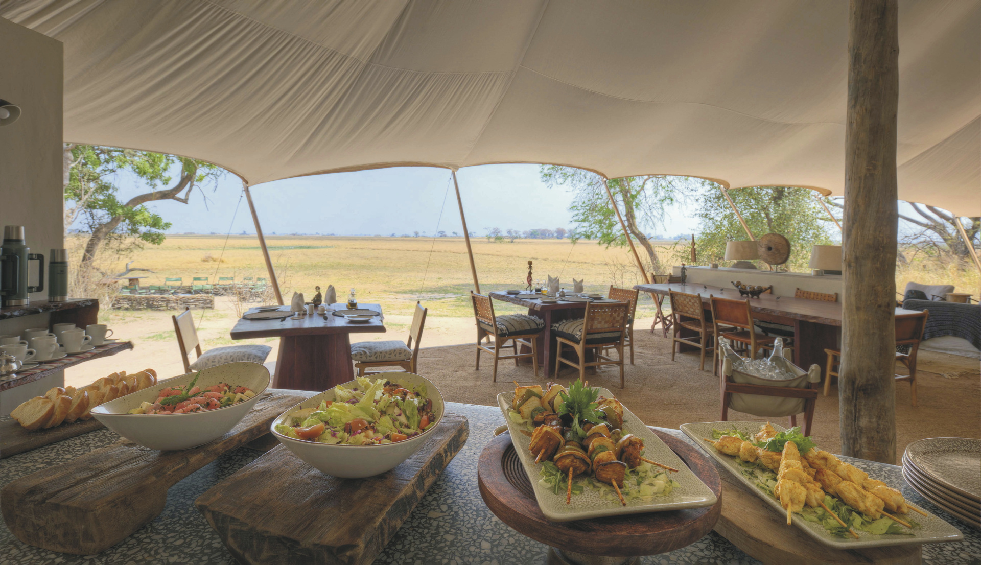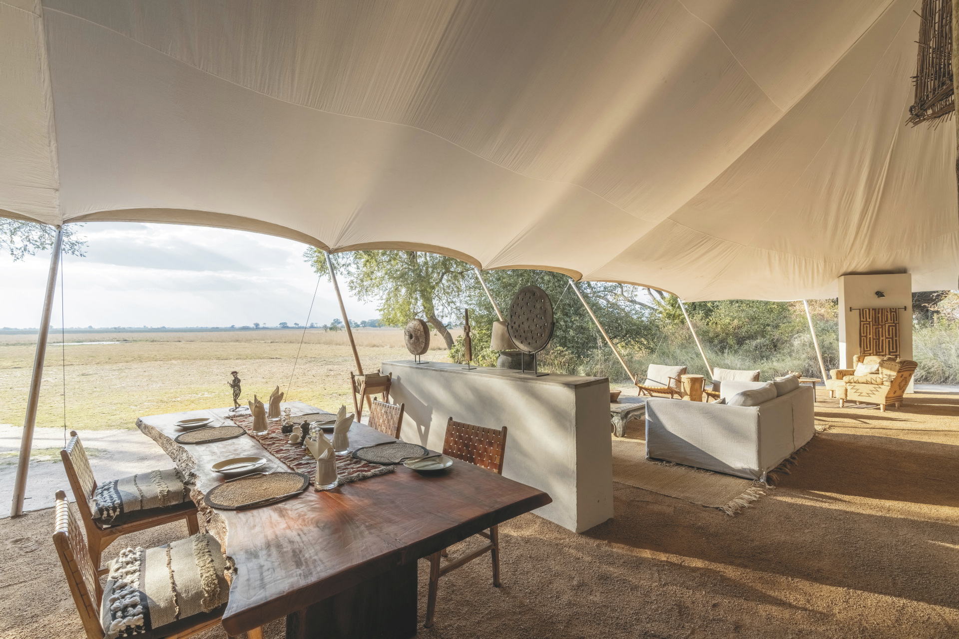 Der Hauptbereich des Camps umfasst eine offene Lounge, einen Essbereich und einen kleinen Pool mit Blick auf die Ebenen. Die Architektur ist inspiriert von Webervogelnestern und fügt sich harmonisch in die Landschaft ein. Die Atmosphäre ist ruhig und naturnah, ideal für Gäste, die sich ganz auf die Wildnis einlassen möchten. Besonders hervorzuheben sind die lautlosen Safaris mit elektrisch betriebenen Geländewagen, die ein intensives Naturerlebnis ermöglichen.Eingeschlossene Leistungen: Pirschfahrten, Buschwanderungen.