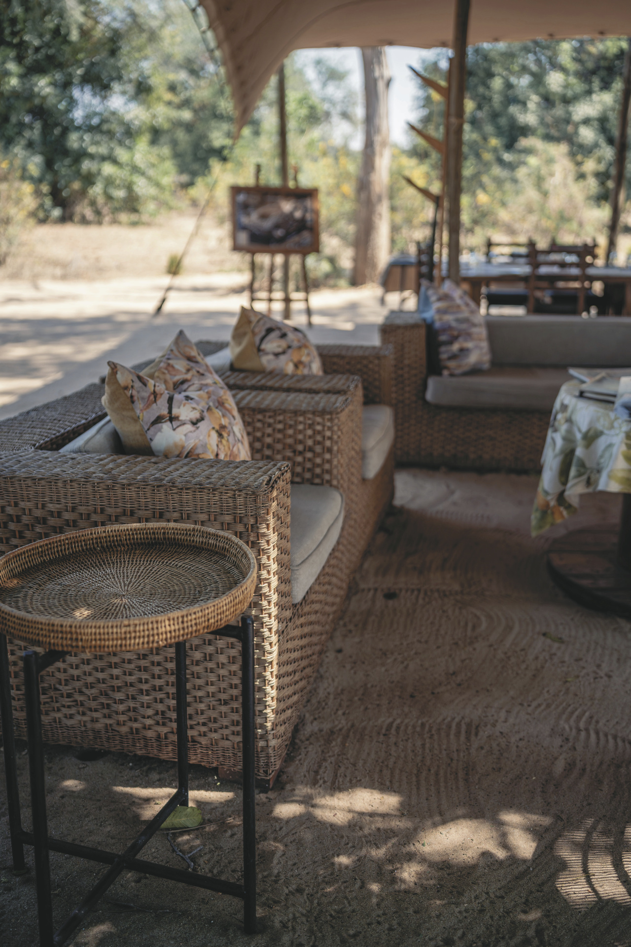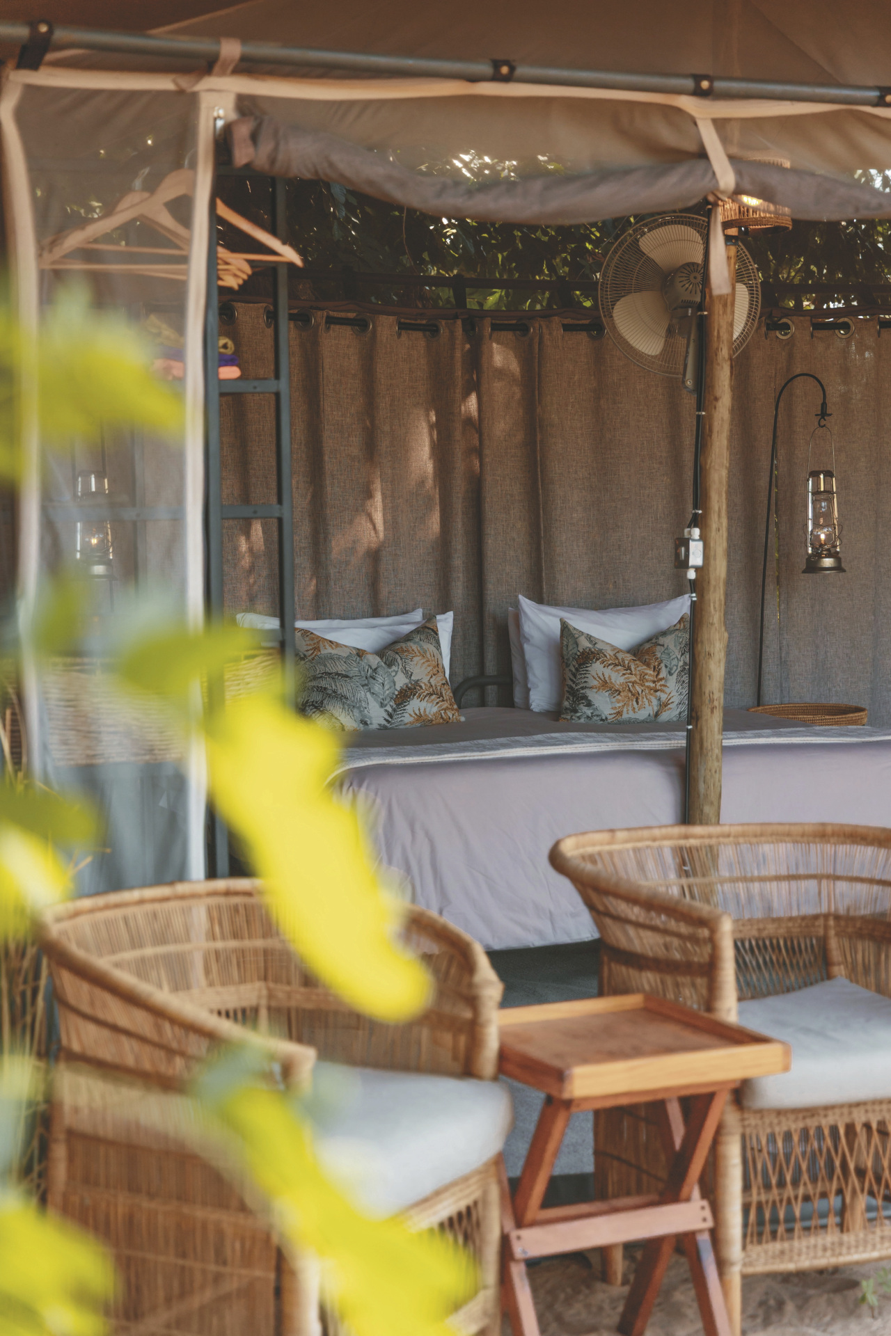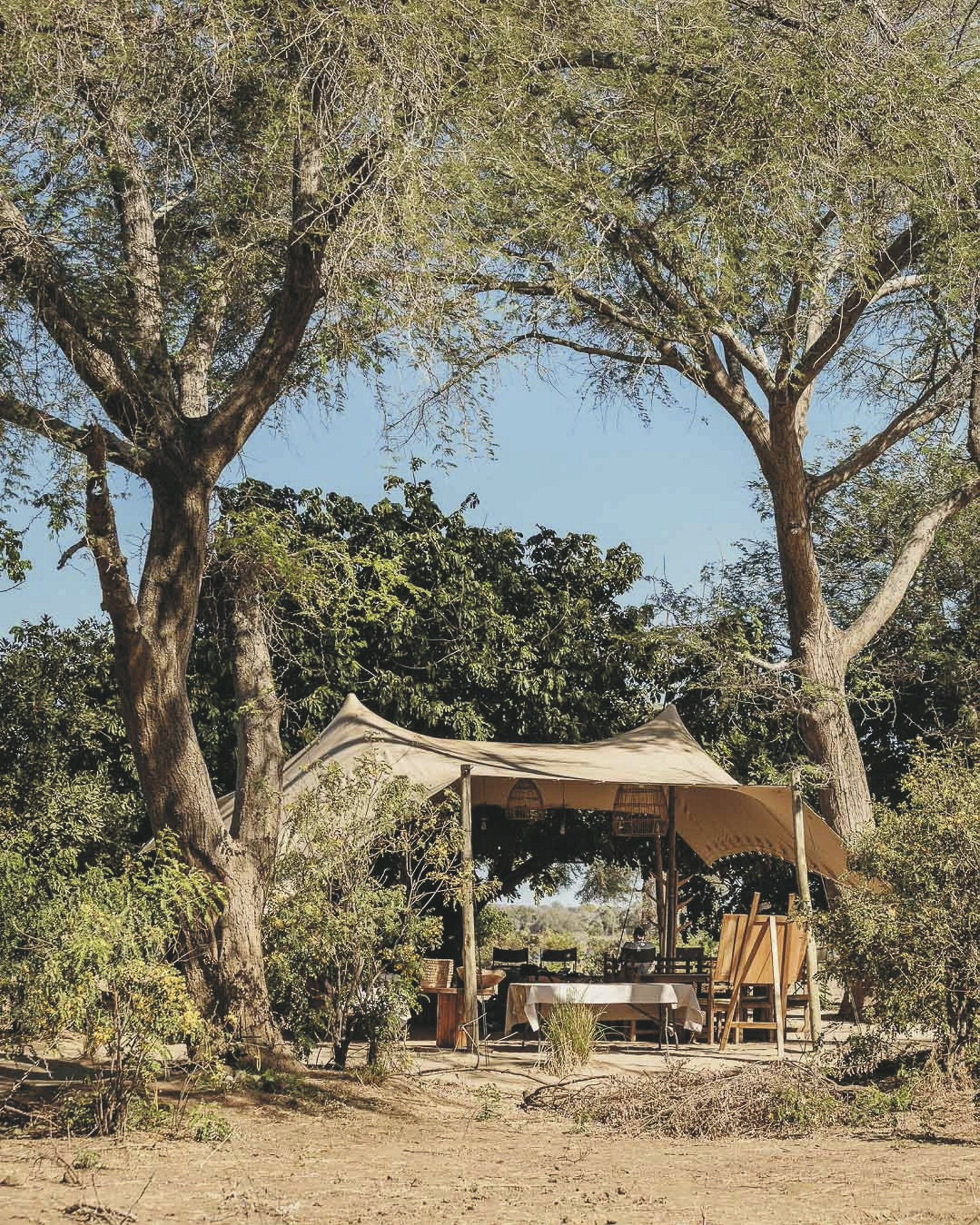 Die sechs Safarizelte sind großzügig und offen gestaltet, sodass Sie die Geräusche der Natur hautnah erleben. Jedes Zelt verfügt über ein eigenes Badezimmer mit Eimerdusche, Waschbecken und Toilette. Ventilatoren und Stromanschlüsse sind vorhanden, die Ausstattung ist schlicht und funktional. Von Ihrer privaten Veranda aus genießen Sie einen direkten Blick auf den Fluss und die vorbeiziehende Tierwelt.
