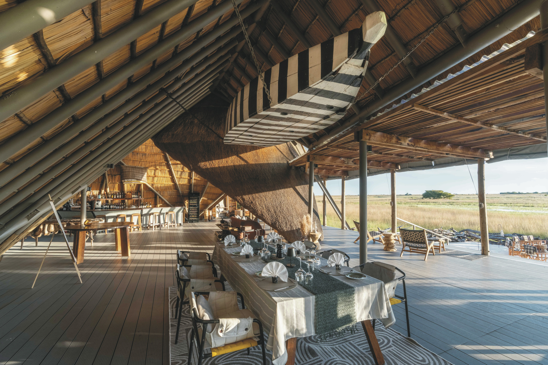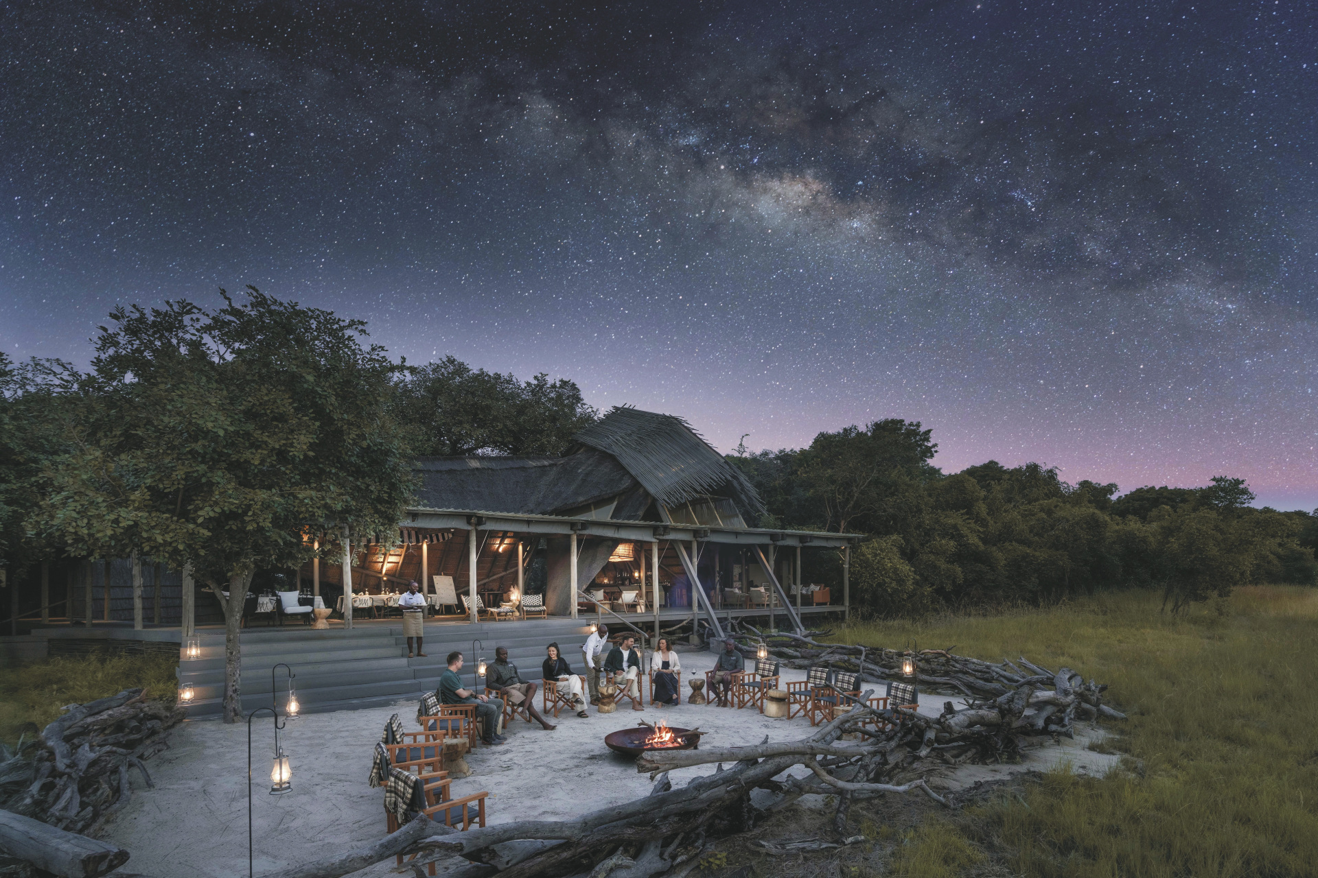 King Lewanika besteht aus einem offenen Hauptbereich mit stilvoller Lounge, gemütlichem Essbereich und einer erhöhten Terrasse, die einen weiten Blick über die Ebenen bietet. Für Entspannung sorgt ein Massageangebot, das Sie nach den Pirschfahrten verwöhnt. Die Architektur aus natürlichen Materialien fügt sich harmonisch in die Landschaft ein und schafft eine warme, authentische Atmosphäre. Kulinarisch erwarten Sie feine Menüs, die unter freiem Himmel serviert werden. Ein besonderes Highlight: Bei einem Aufenthalt von drei Nächten erleben Sie das „Wilderness Sleep Out“, eine Übernachtung unter dem Sternenhimmel, die der spektakulären Gnu-Migration folgt.Eingeschlossene Leistungen: Es handelt sich um ein 3-Nächte-Paket mit Flügen ab/bis Lusaka oder Livingstone, Übernachtung, Vollpension, lokale Getränke, Aktivitäten (Pirschfahrten, Buschwanderungen, Kajakfahrten (saisonal)) und Nationalparkgebühren.