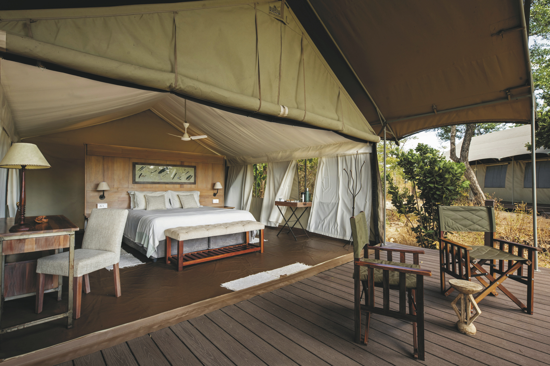 Die 8 großzügigen Safarizelt im klassischen Safaristil sind auf Holzplattformen errichtet und fügen sich nahtlos in die Umgebung ein. Jedes Zelt verfügt über ein eigenes Bad mit Außendusche, Ventilator und eine kleine, überdachte Terrasse lädt zum Entspannen und Wohlfühlen ein.