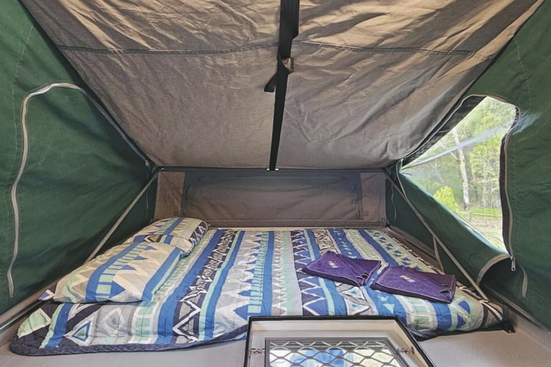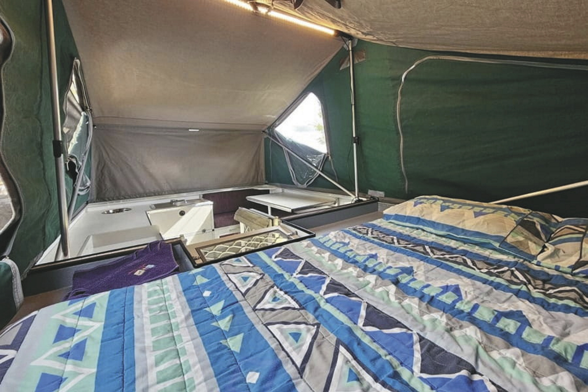 Das Besondere beim Trayon Camper ist die kleine, durchdachte Campingkabine mit aufklappbarem Dach. In der Kabine ist Platz für eine Küchenzeile, einen Esstisch und ein Doppelbett. Geeignet für 1-2 Personen.