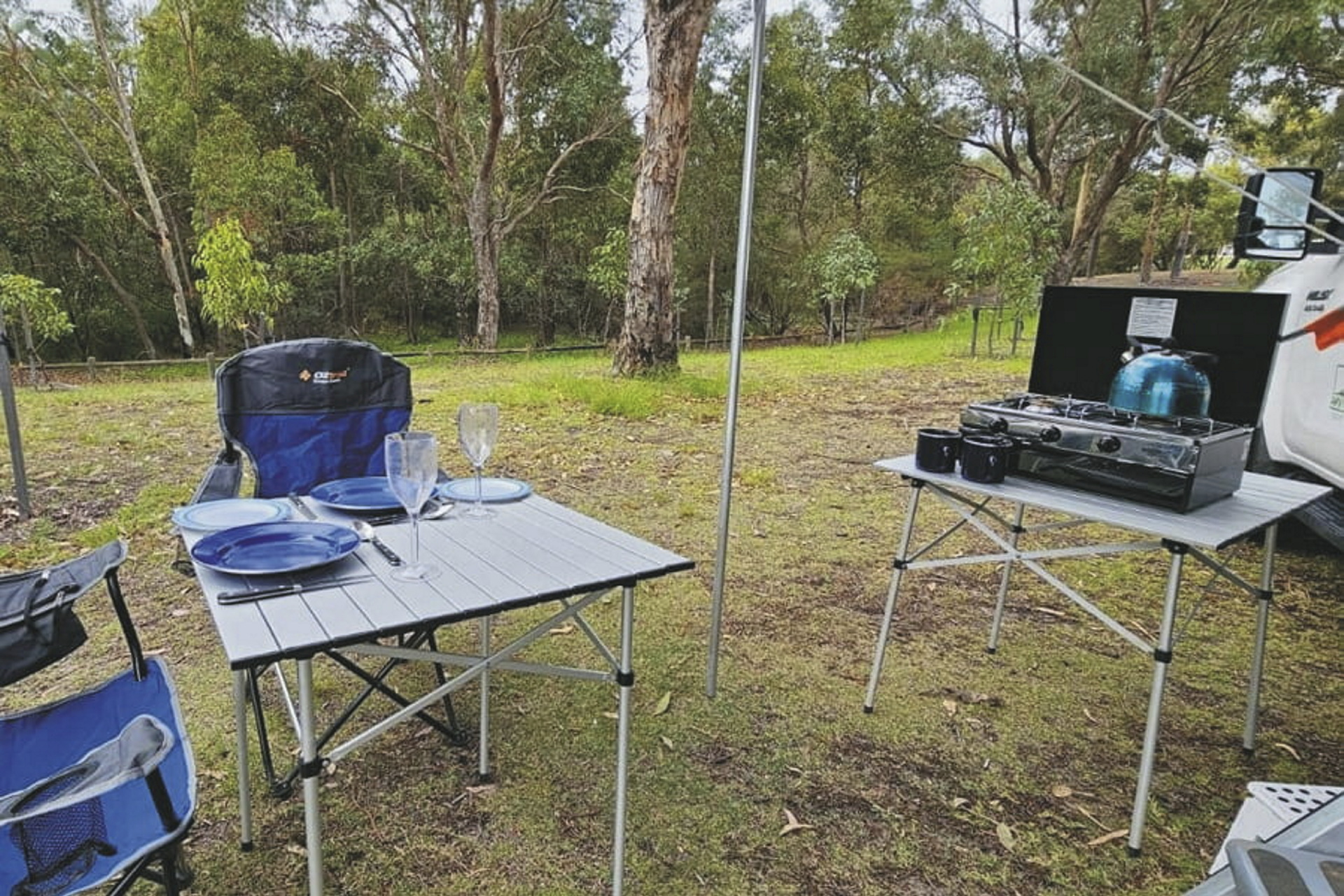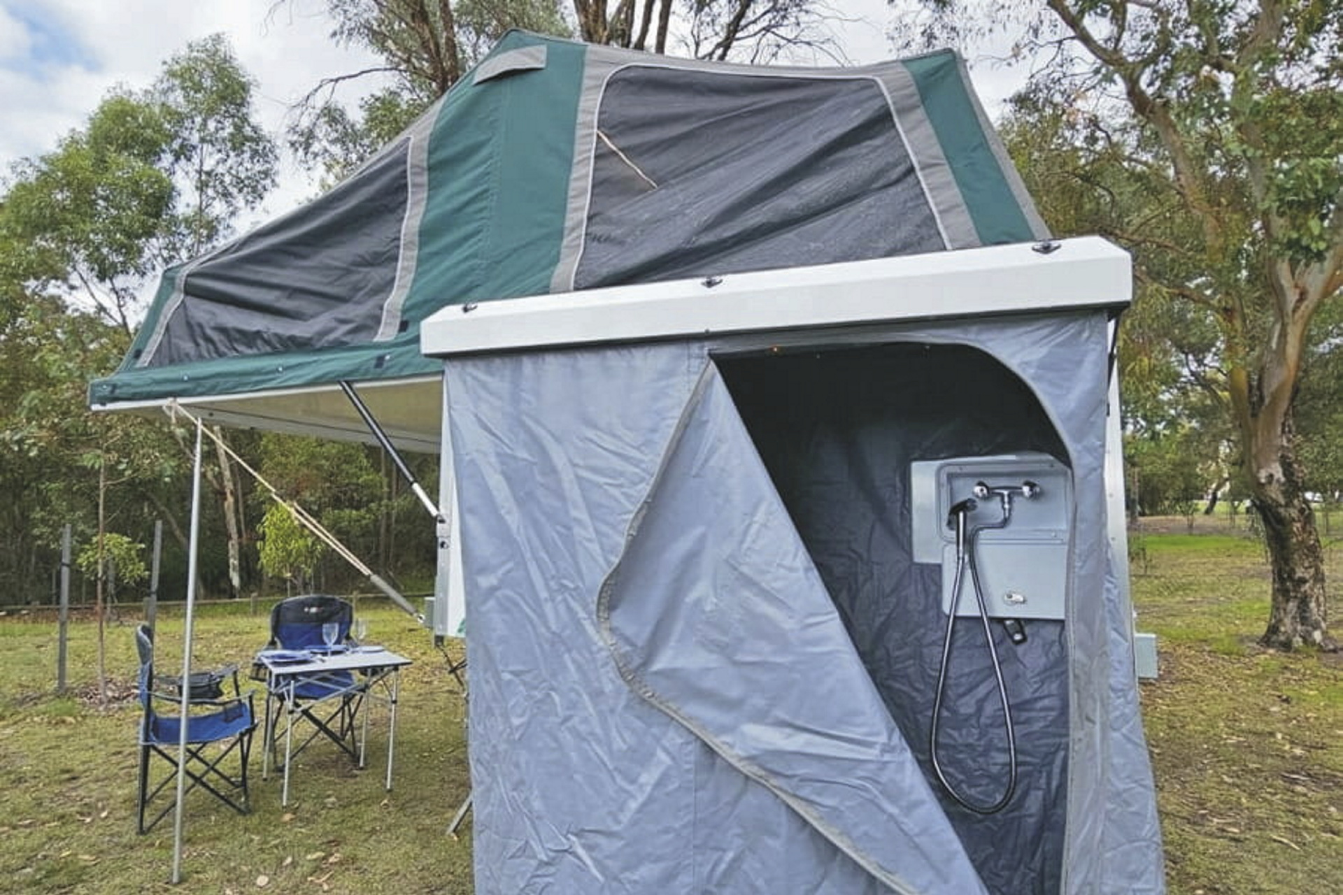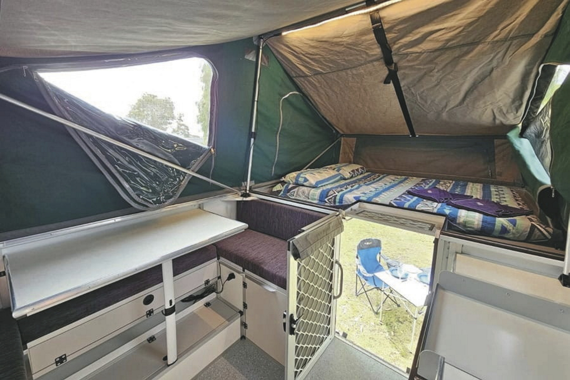 • aus-/aufklappbare Campingkabine mit Esstisch und 2 Sitzen, Spüle (12 V, Kaltwasser), tragbarem 2-flammigem Gaskocher und 85 l Kühlschrank (12 V)