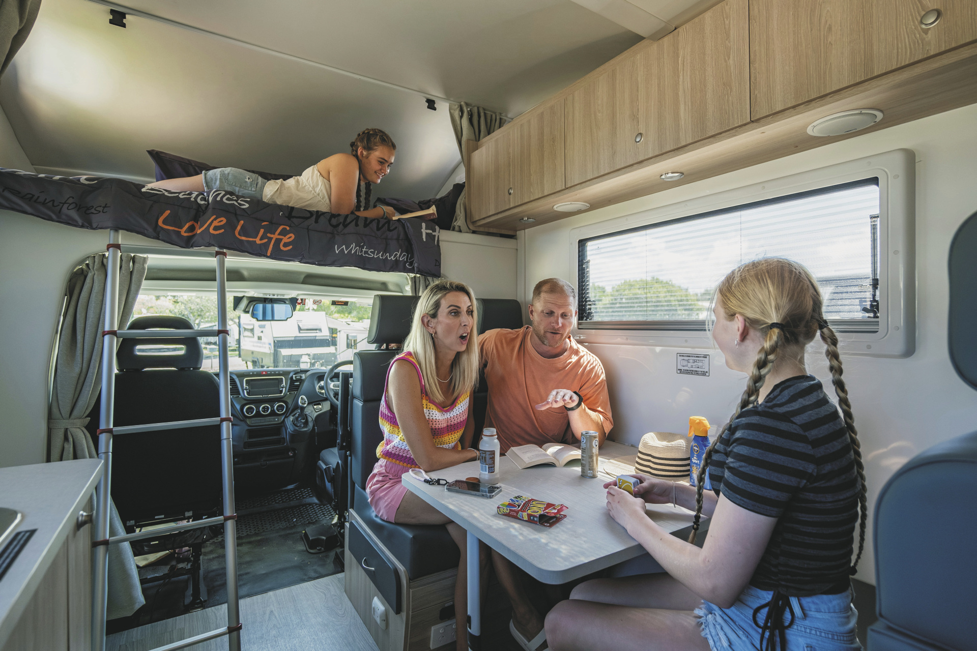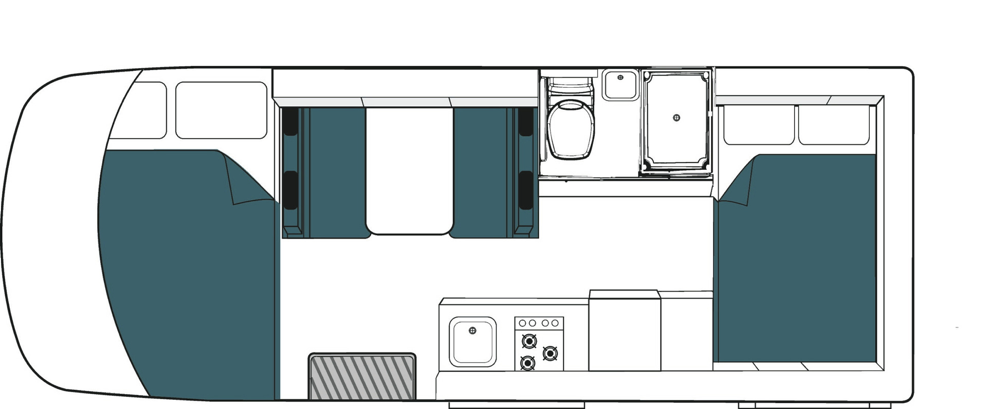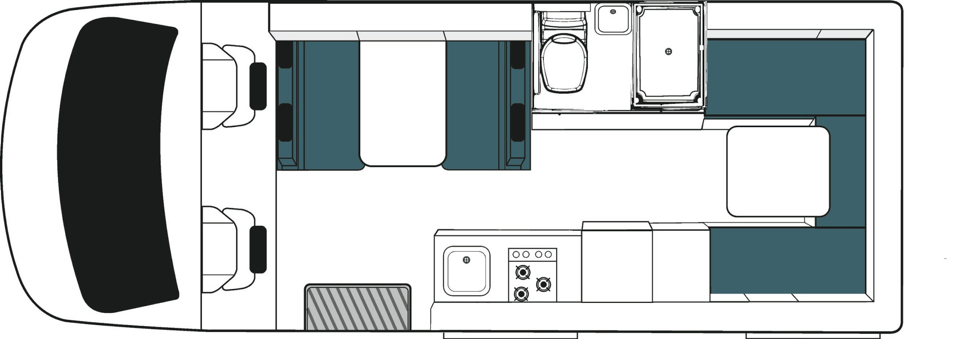 • Doppelbett über der Fahrerkabine 2,13 x 1,35 m (mit Schutznetz zur Sicherheit für Kinder)• Sitzgruppe im Heck, zum Doppelbett umbaubar 2,13 x 1,40 m