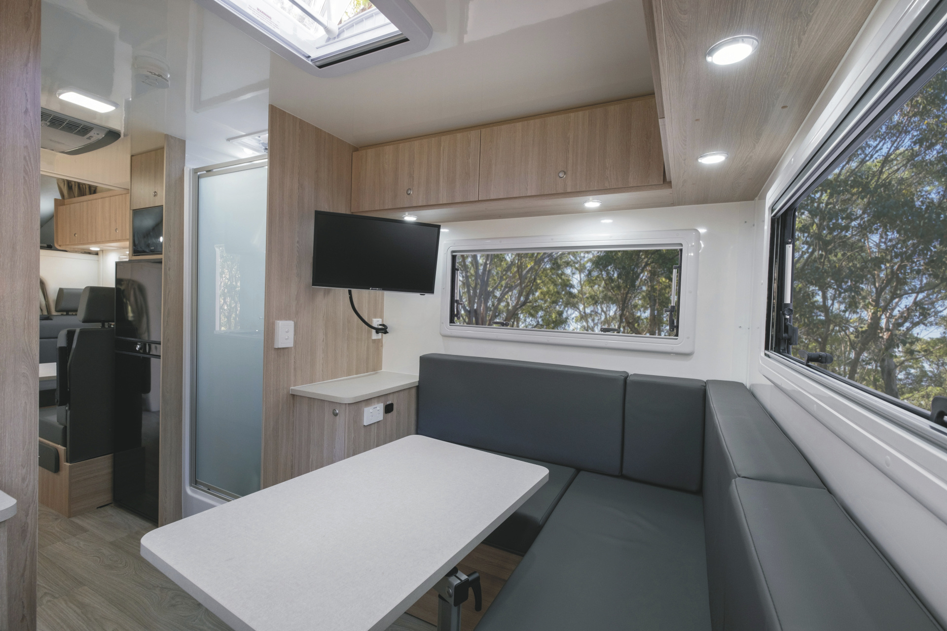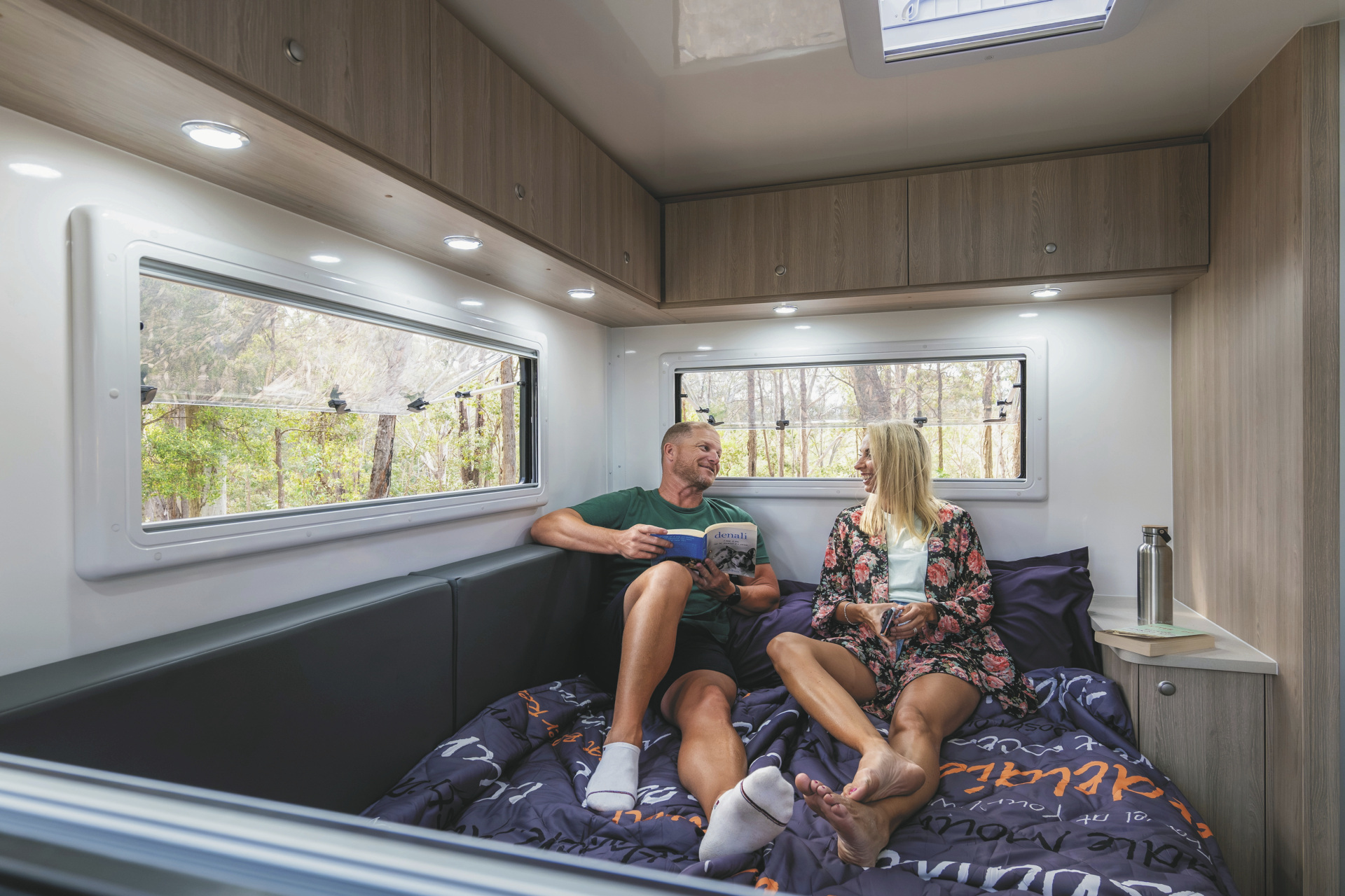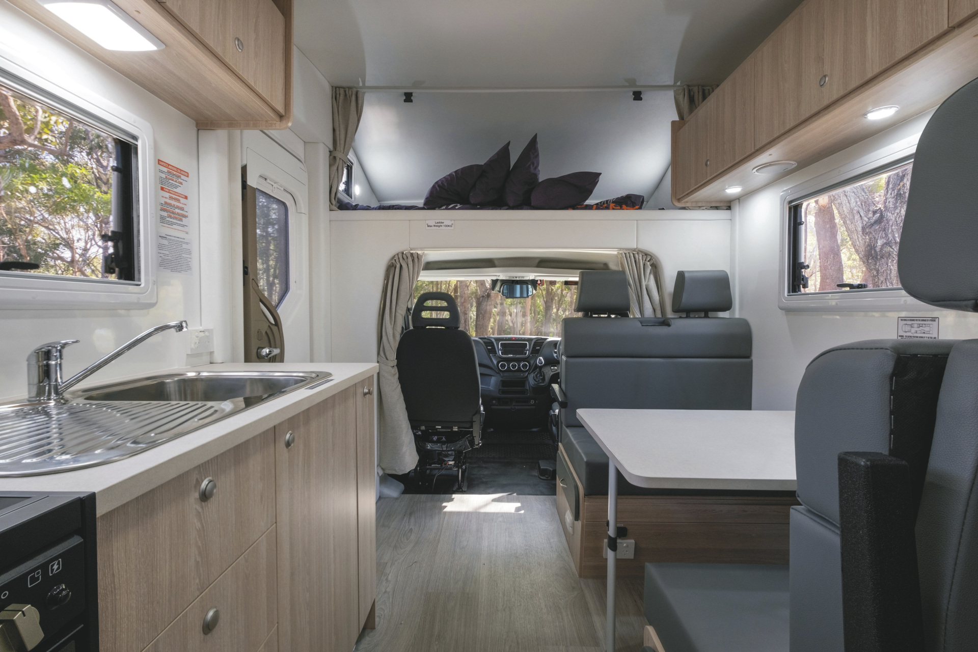 • Doppelbett über der Fahrerkabine 2,13 x 1,35 m (mit Schutznetz zur Sicherheit für Kinder)• Sitzgruppe im Heck, zum Doppelbett umbaubar 2,13 x 1,40 m