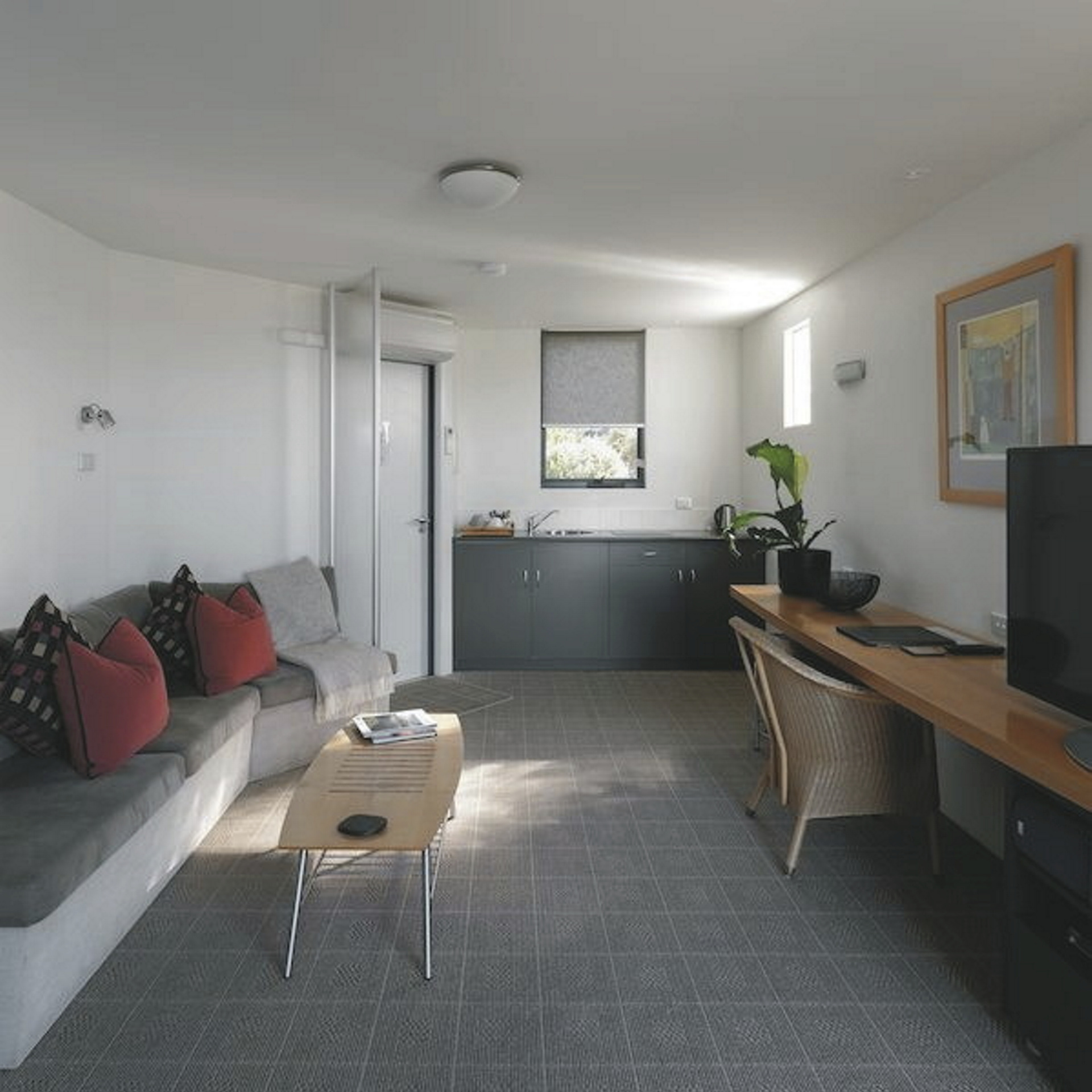 14 moderne Meerblick-Studios im Reihenhausstil und 6 Vintage Chalets, alle mit Blick über die Bucht und auf die Hazards Mountains. Studios sind zeitgemäß ausgestattet mit King-Size-Bett, Lounge-Bereich mit ausziehbarem Sofa-Bett, Bad mit Dusche/WC und Fön, LED-TV, Klimaanlage, eigenem Deck und Kitchenette mit Toaster, Tee-/Kaffeekochgelegenheit und kleinem Kühlschrank. Frühstück ist für Gäste dieser Kategorie inkludiert.Die abgeschieden gelegenen Vintage Chalets sind von typisch australischen Strandhütten der 1980er Jahre inspiriert. Sie bieten einen großen Wohn-/Essbereich, zwei Schlafzimmer (1x Queen-size Doppelbett, 1x drei Einzelbetten) und verfügen über eine voll ausgestattete Küche, Waschmaschine/-trockner sowie eine Veranda mit BBQ-Bereich.