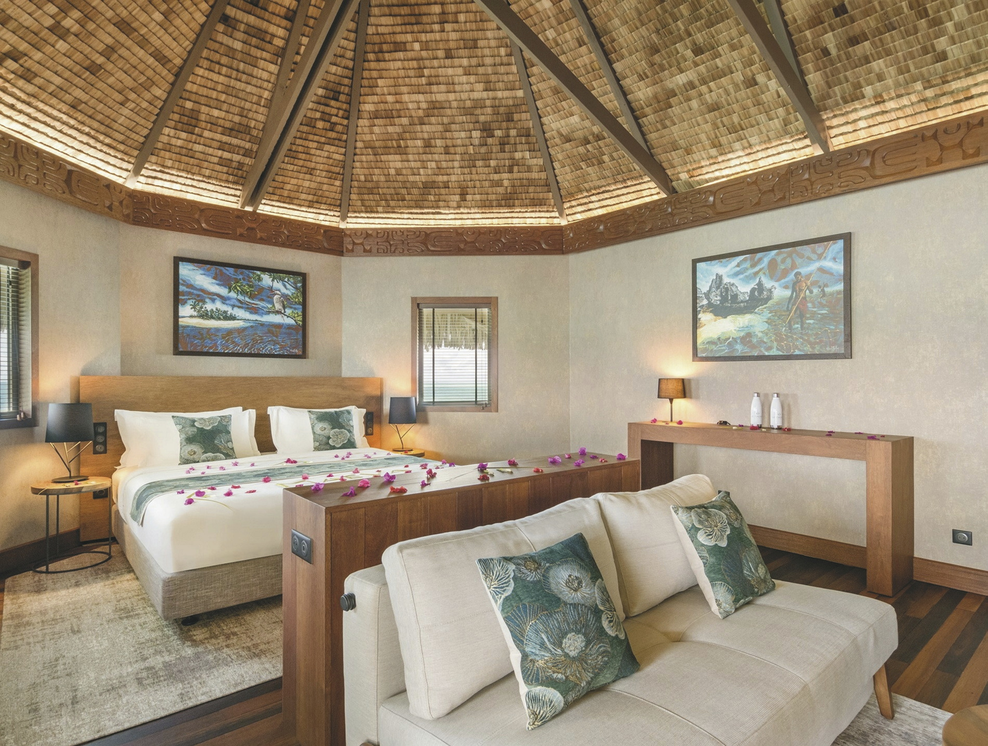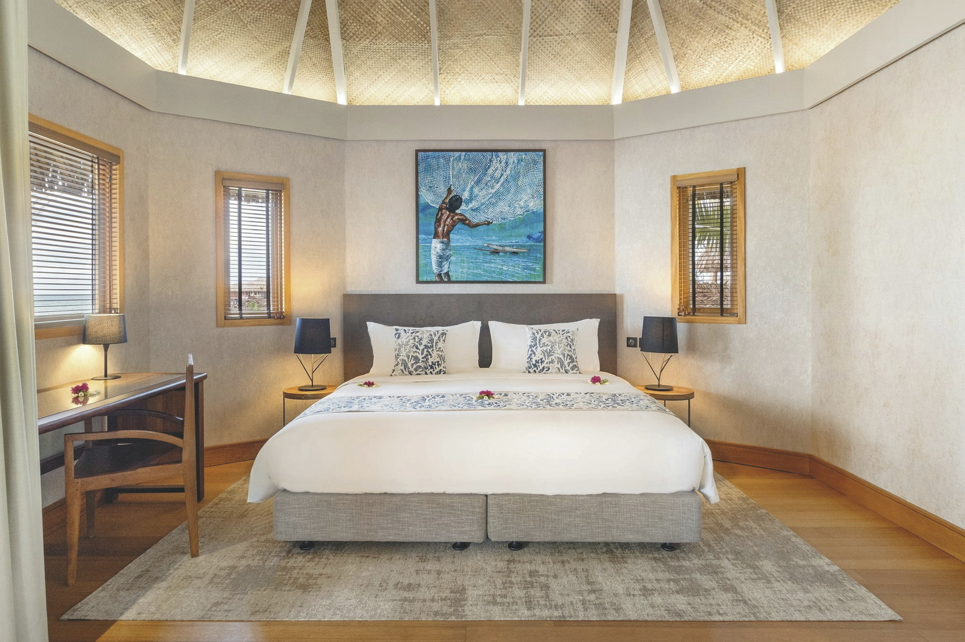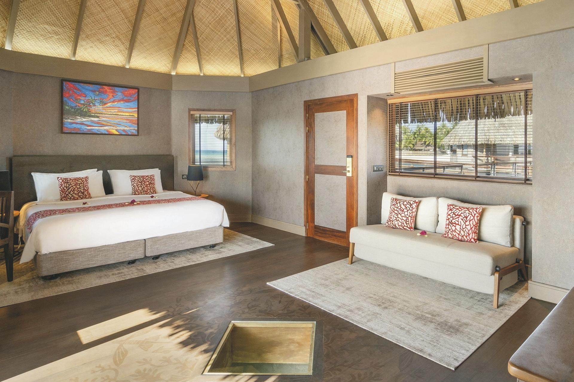 Alle 33 Bungalows sind im polynesischen Design gehalten und verfügen über Terrasse, Ventilator, Minibar, Tee-/Kaffeezubereiter, Telefon, Safe, Bügeleisen, Fön und TV. Strandbungalows mit Klimaanlage. Durch das Glasfenster im Boden der nicht-klimatisierten Overwater-Bungalows können Sie die bunten Fische in der Lagune beobachten. Premium Overwater-Bungalows bieten zusätzlich Zugang zum Meer und MP3. Overwater-Suiten mit Klimaanlage und Badewanne.