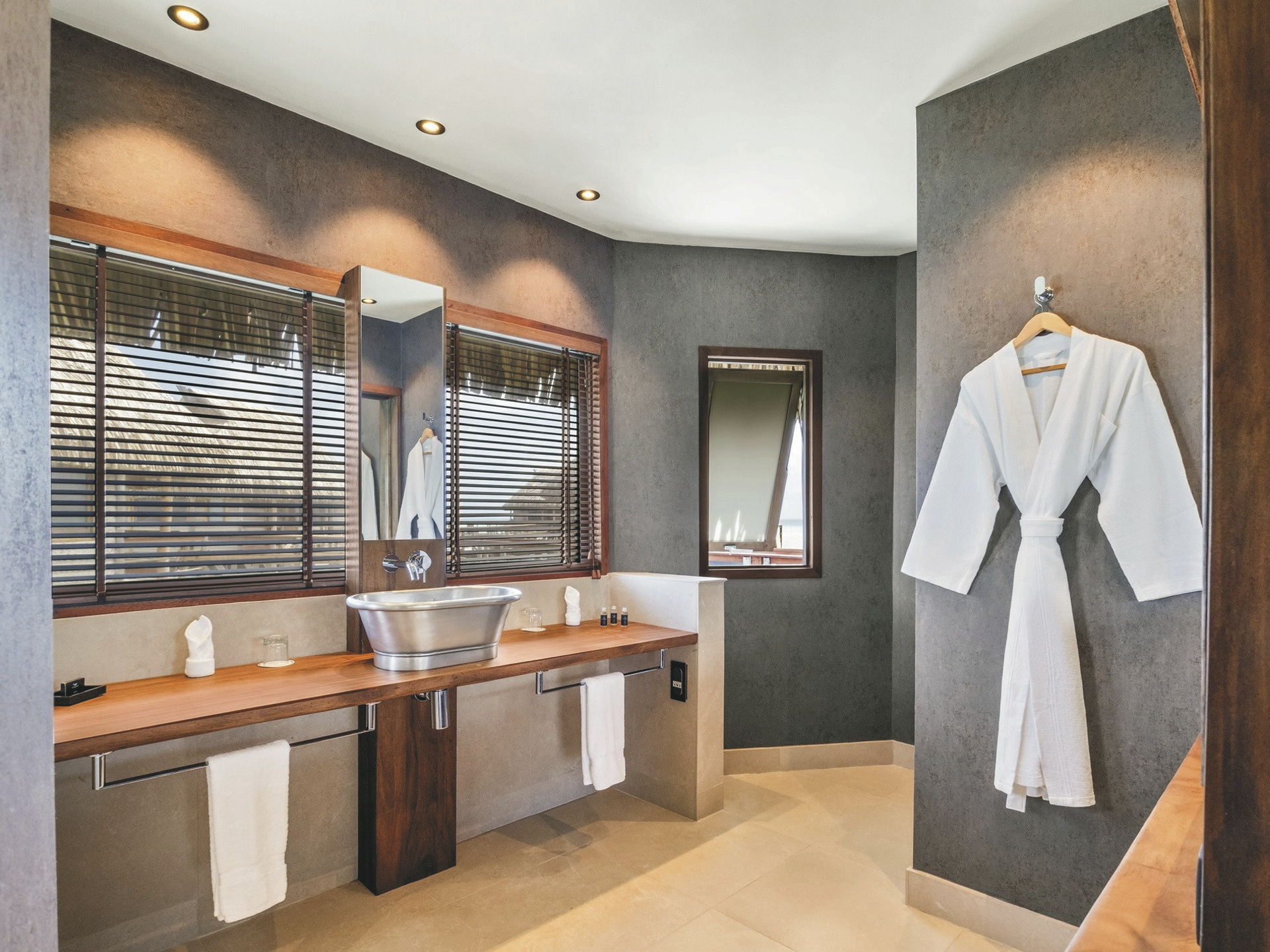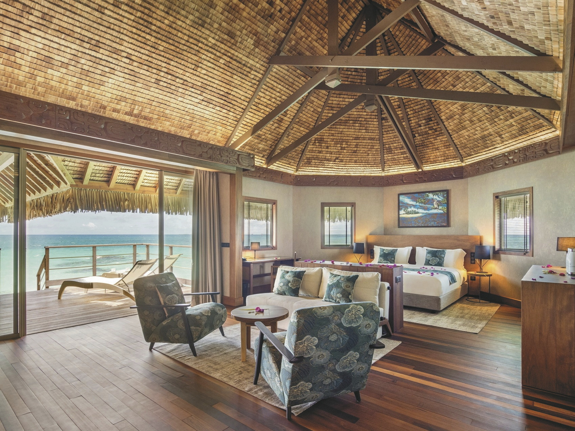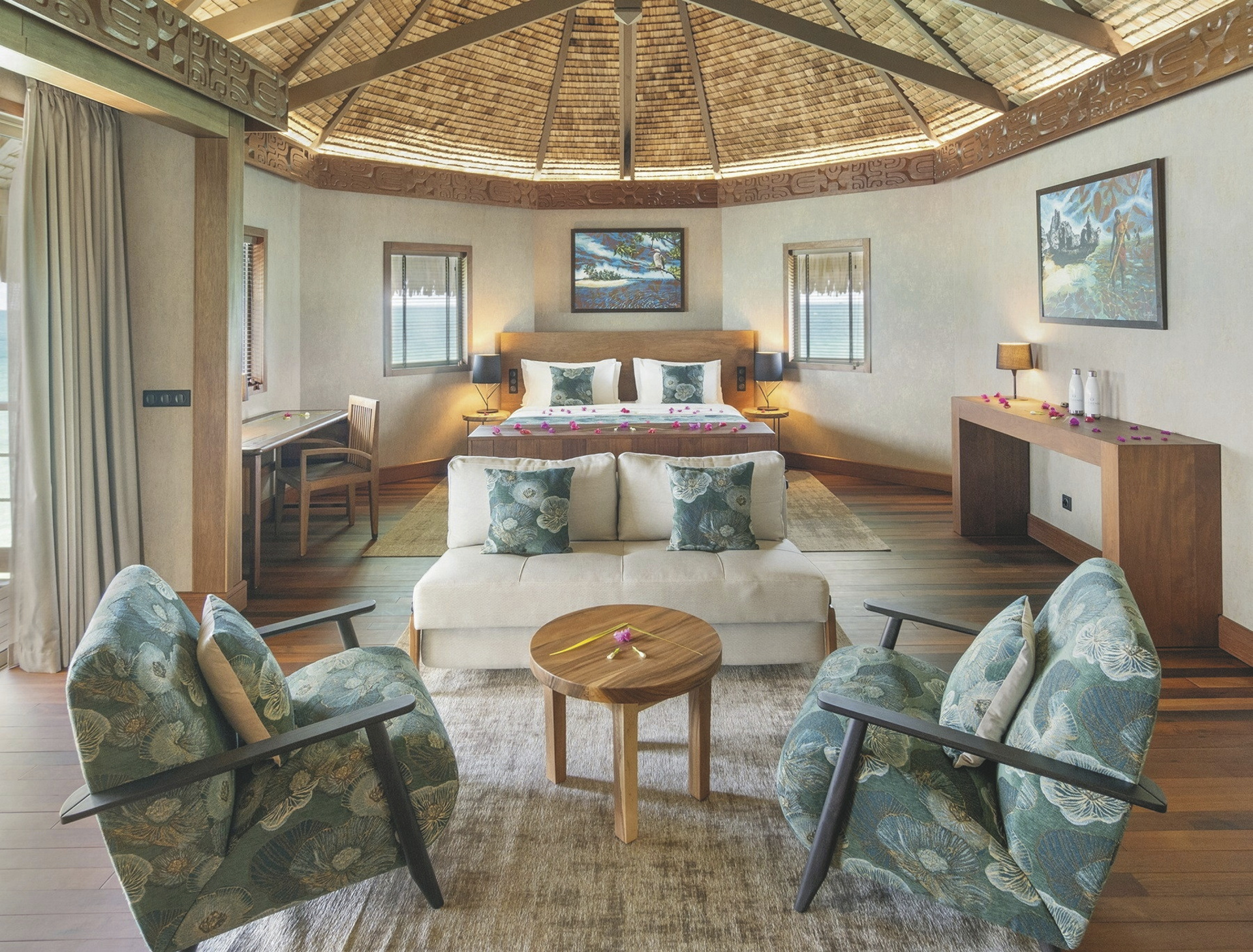 Alle 33 Bungalows sind im polynesischen Design gehalten und verfügen über Terrasse, Ventilator, Minibar, Tee-/Kaffeezubereiter, Telefon, Safe, Bügeleisen, Fön und TV. Strandbungalows mit Klimaanlage. Durch das Glasfenster im Boden der nicht-klimatisierten Overwater-Bungalows können Sie die bunten Fische in der Lagune beobachten. Premium Overwater-Bungalows bieten zusätzlich Zugang zum Meer und MP3. Overwater-Suiten mit Klimaanlage und Badewanne.